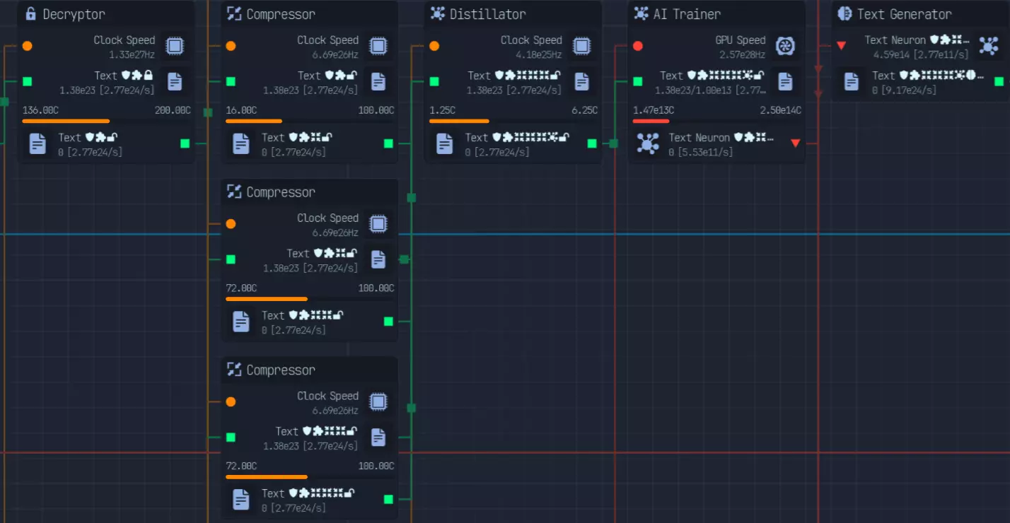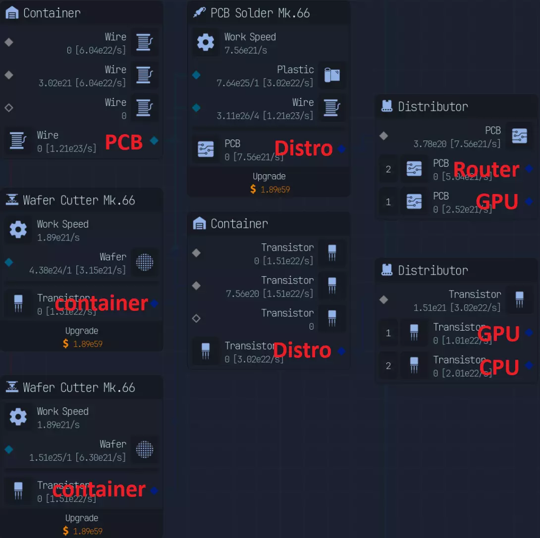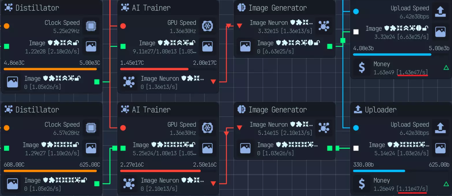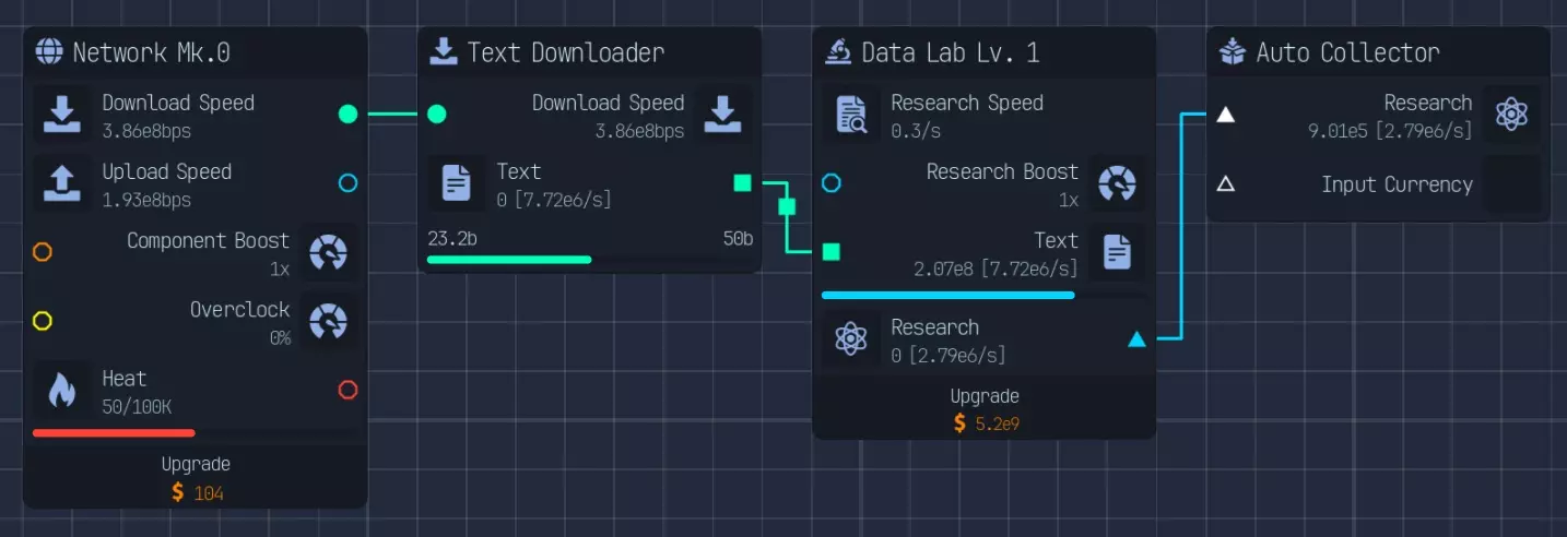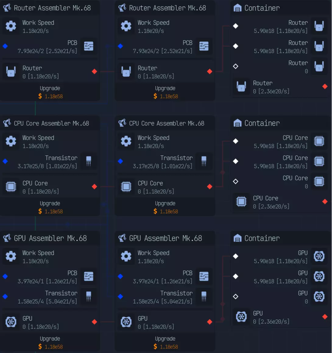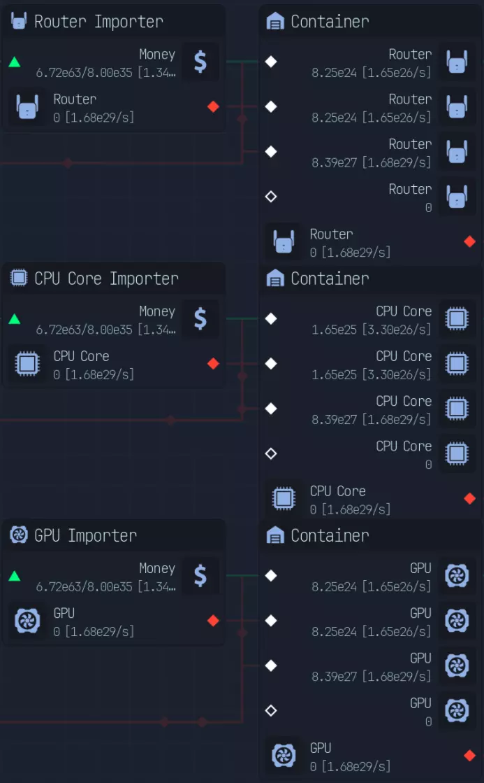 随着游戏进程推进,上传速度会成为瓶颈,因此在特定阶段后,3倍压缩将是最佳选择。具体来说,当你的文件下载数量低于AI生成文件数量时。 **游戏后期:组件装配** 组件装配是指创建用于提升网络、CPU、GPU性能的组件。 这是硬件达到最高等级后主要的推进方式。 处理组件装配有多种方法: - 仅建造装配器,并放置路由器/CPU/GPU输入器 - 在某个上游节点开始,或者从最上游开始 仅使用输入器进行设置是我发现的最简单快捷的方式,无需维护升级,可自动扩展。 这种方式最简单且推荐使用,因为它无需额外步骤即可良好扩展。我将收入按9:1的比例分配,其中90%用于投入到路由器、CPU、GPU导入器(此时资金仅用于升级数据实验室)