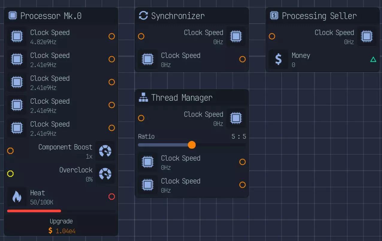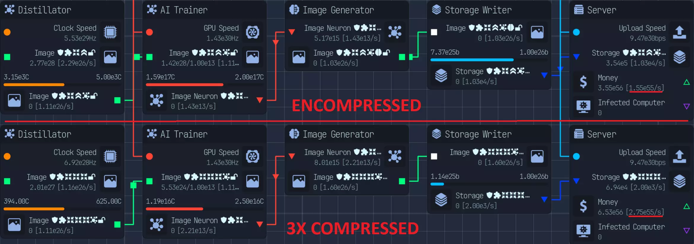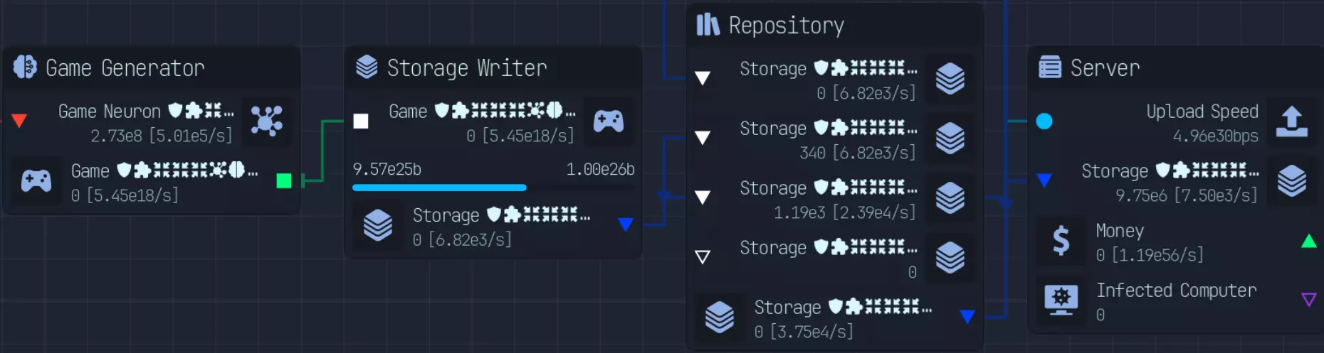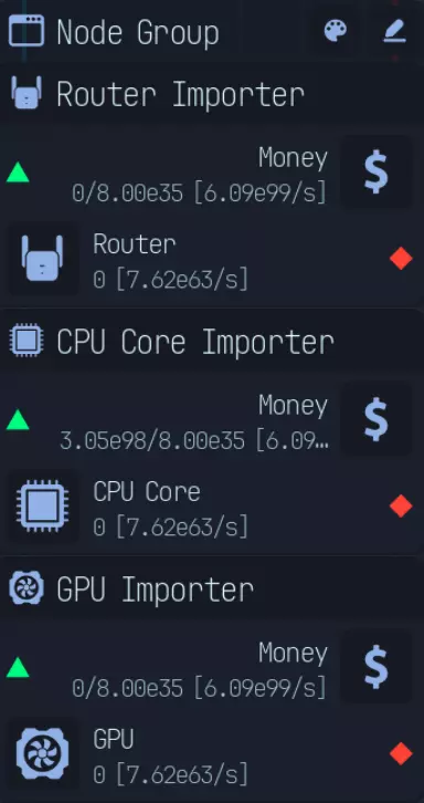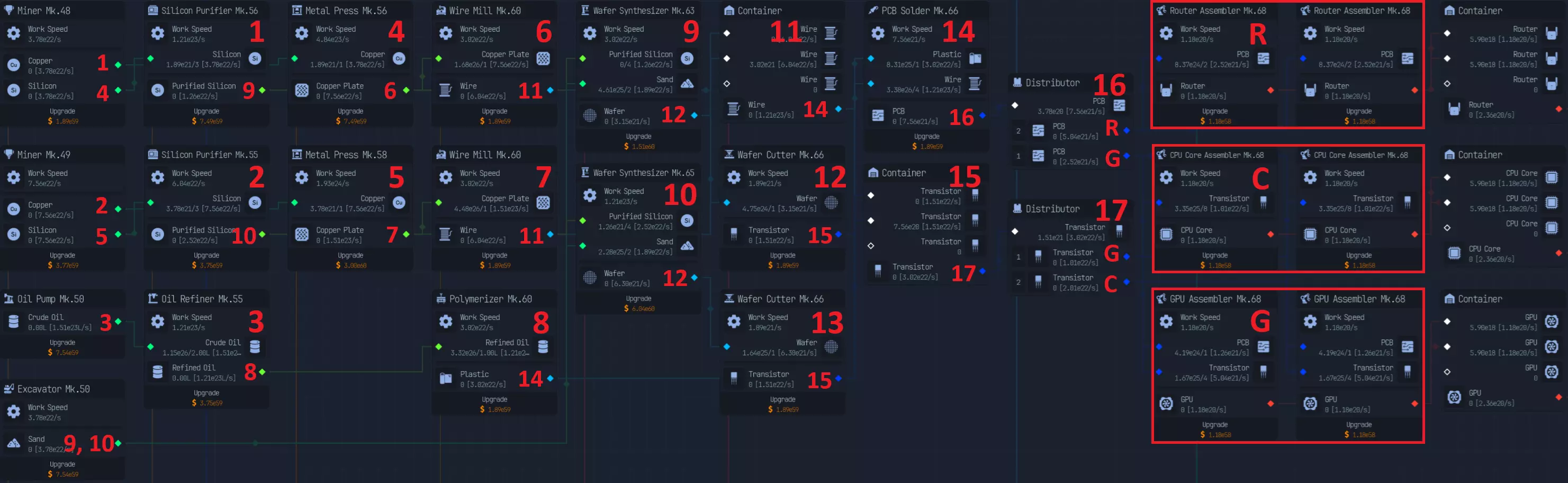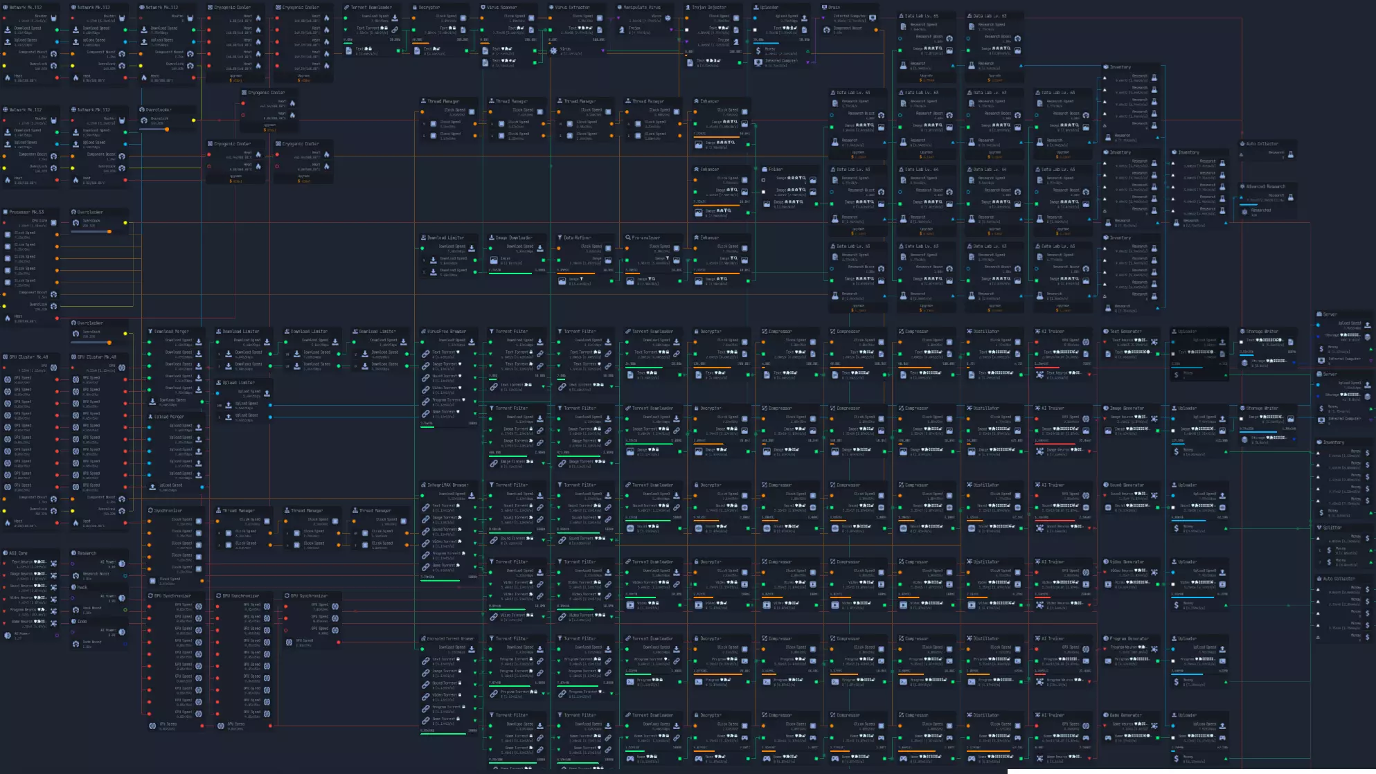 随着游戏进程推进,上传速度会成为瓶颈,因此在特定阶段后,3倍压缩将是最佳选择。具体来说,当你的文件下载数量低于AI生成文件数量时。 **游戏后期:组件装配** 组件装配是指创建用于提升网络、CPU、GPU性能的组件。 这是硬件达到最高等级后主要的推进方式。 处理组件装配有多种方法: - 仅建造装配器,并放置路由器/CPU/GPU输入器 - 在某个上游节点开始,或者从最上游开始 仅使用输入器进行设置是我发现的最简单快捷的方式,无需维护升级,可自动扩展。 这种方式最简单且推荐使用,因为它无需额外步骤即可良好扩展。我将收入按9:1的比例分配,其中90%用于投入到路由器、CPU、GPU导入器(此时资金仅用于升级数据实验室)