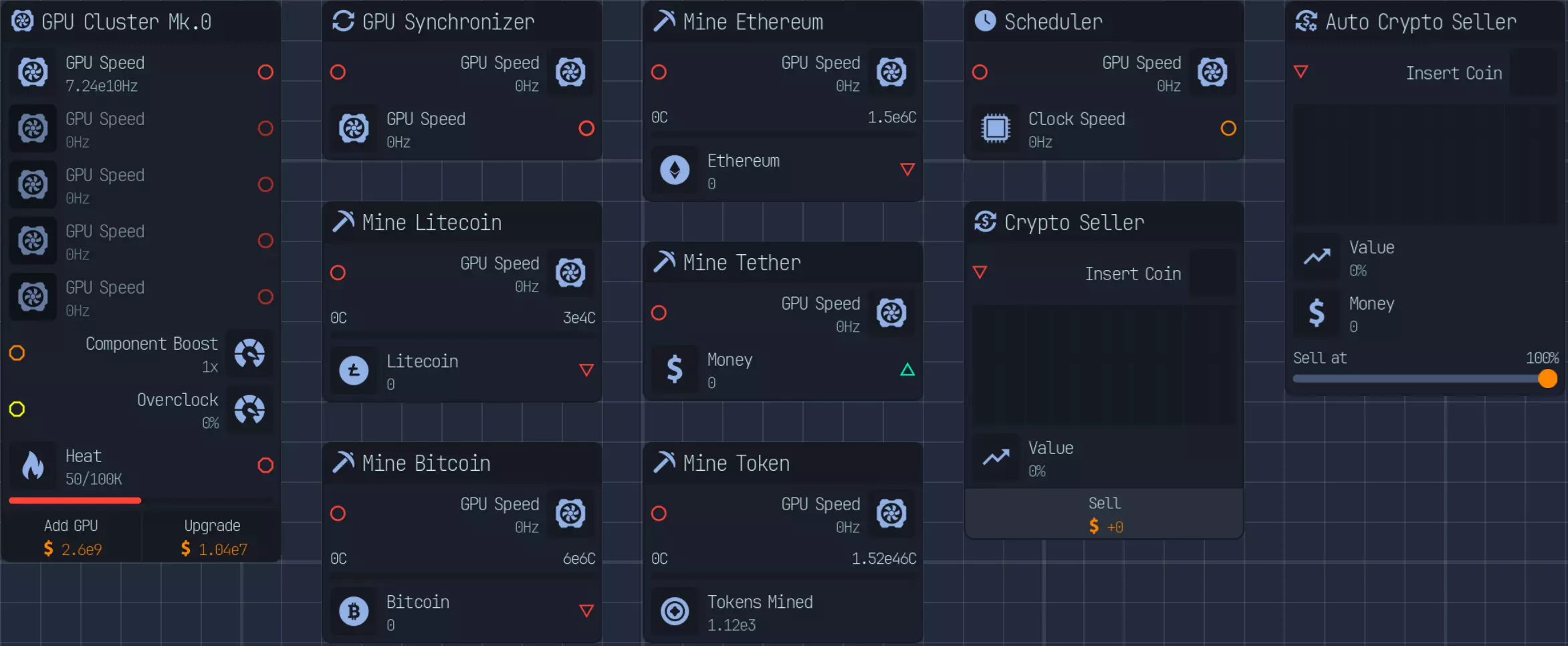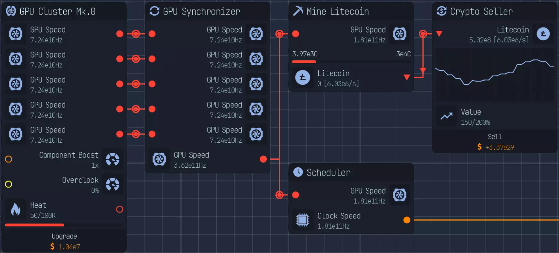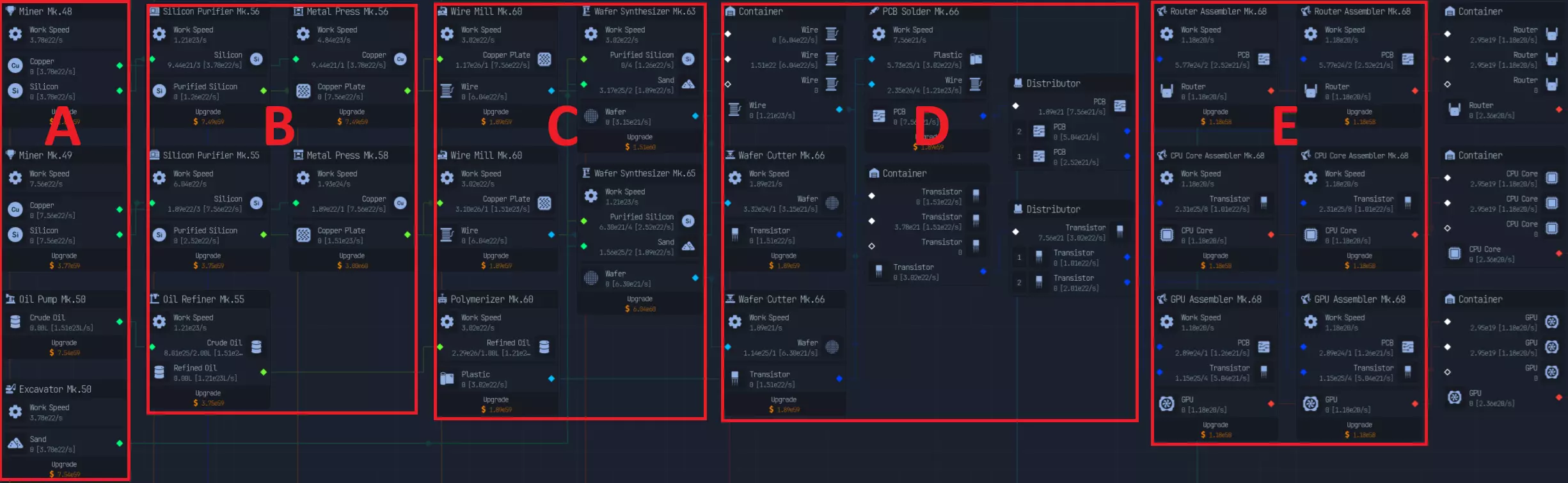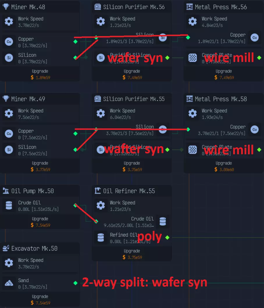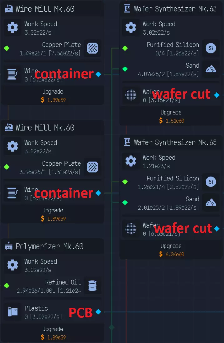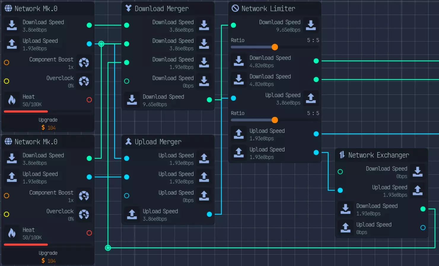 随着游戏进程推进,上传速度会成为瓶颈,因此在特定阶段后,3倍压缩将是最佳选择。具体来说,当你的文件下载数量低于AI生成文件数量时。 **游戏后期:组件装配** 组件装配是指创建用于提升网络、CPU、GPU性能的组件。 这是硬件达到最高等级后主要的推进方式。 处理组件装配有多种方法: - 仅建造装配器,并放置路由器/CPU/GPU输入器 - 在某个上游节点开始,或者从最上游开始 仅使用输入器进行设置是我发现的最简单快捷的方式,无需维护升级,可自动扩展。 这种方式最简单且推荐使用,因为它无需额外步骤即可良好扩展。我将收入按9:1的比例分配,其中90%用于投入到路由器、CPU、GPU导入器(此时资金仅用于升级数据实验室)
