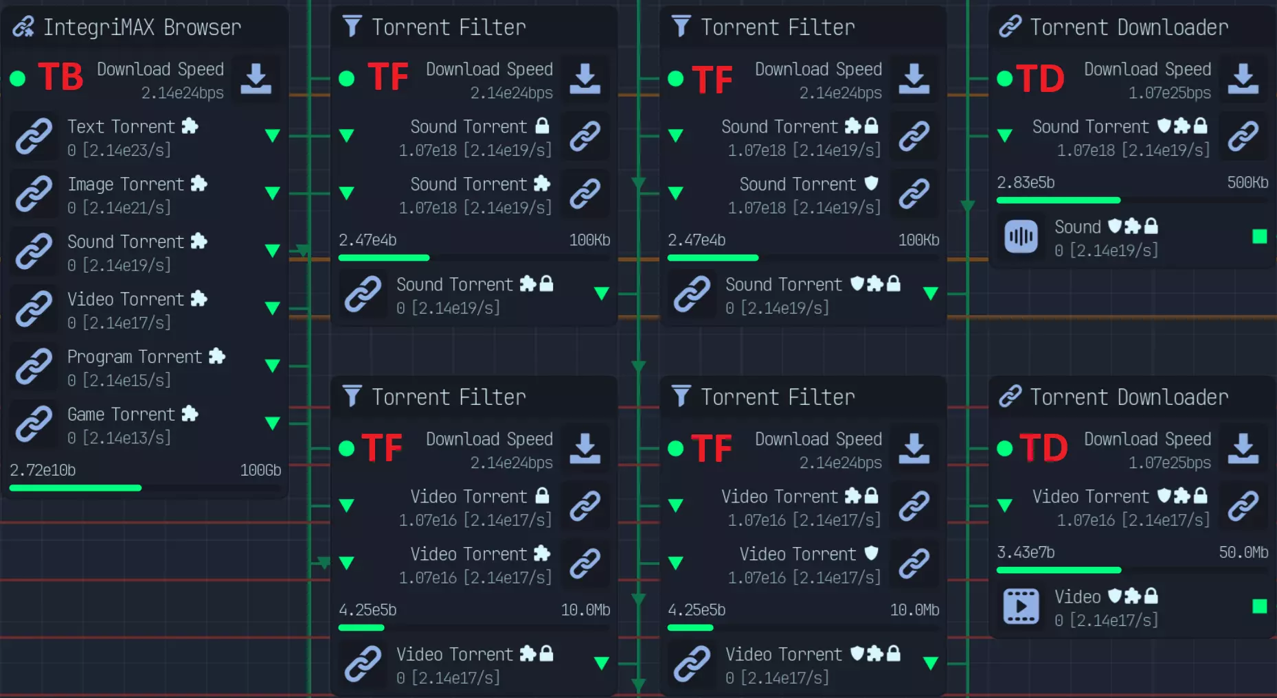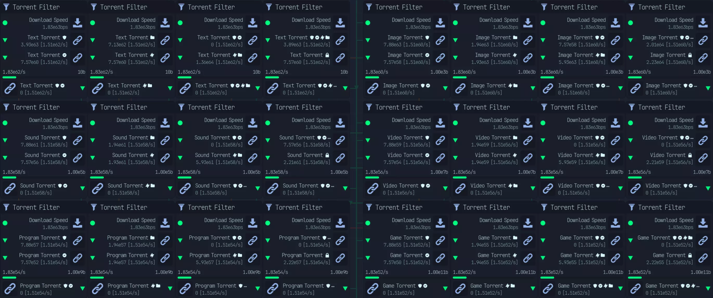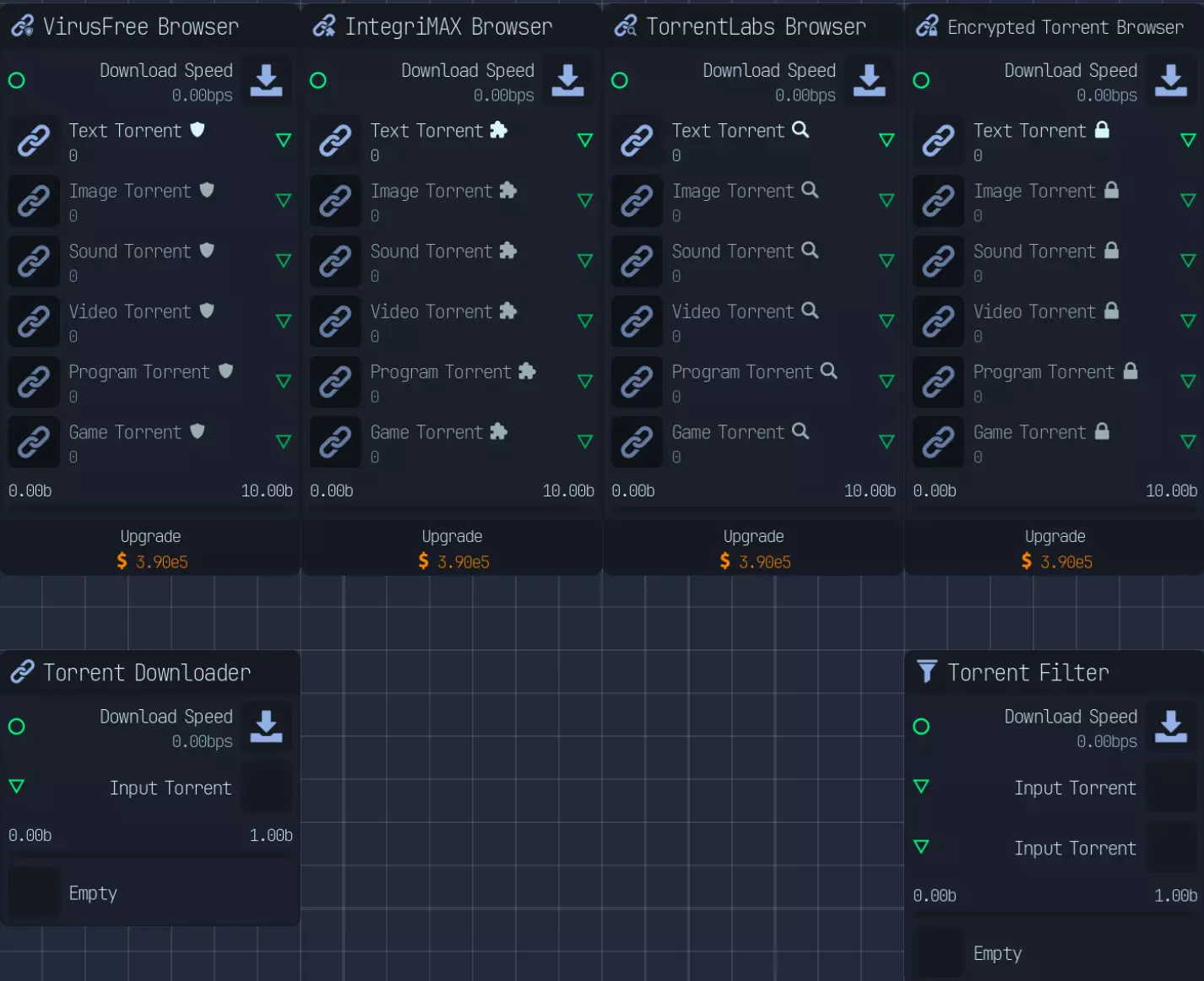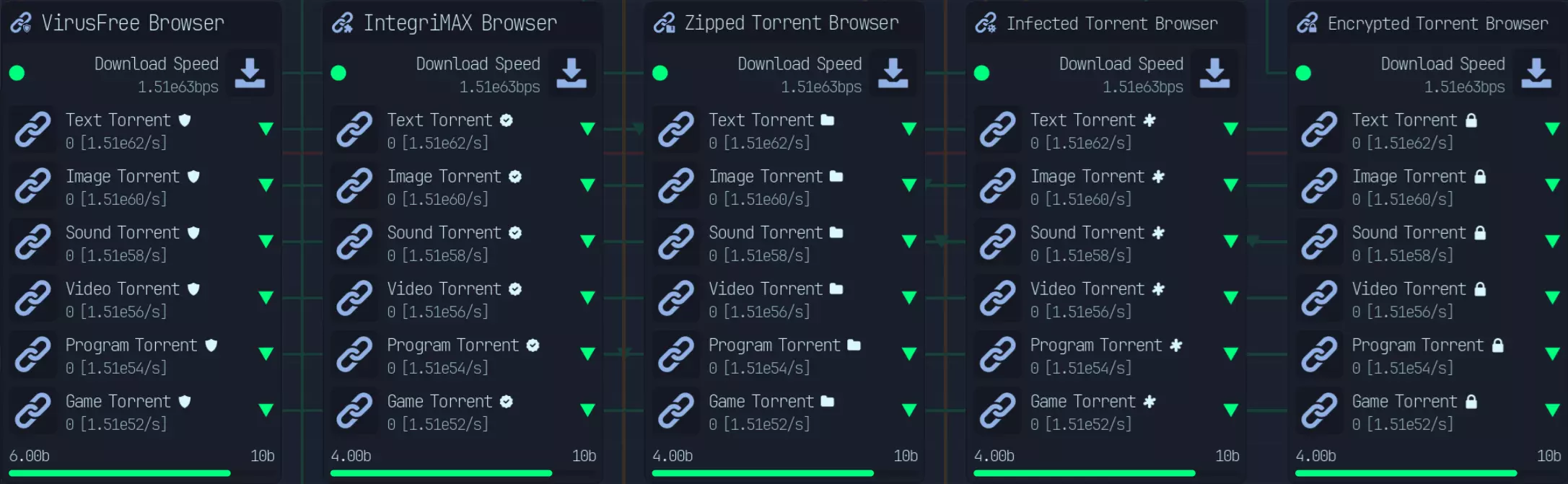 共有6种不同的种子浏览器: - 无病毒(VirusFree):已扫描 - 感染种子(Infected Torrent):已感染 - 完整性最大化(IntegriMAX):已验证 - 种子实验室(TorrentLabs):已预先分析 - 压缩种子(Zipped Torrent):已压缩 - 加密种子(Encrypted Torrent):已加密 这些修饰符会在开始时添加,但需要以牺牲下载速度为代价。 尤其是“加密”,因为没有其他方法可以获得此修饰符。 并非必须全部使用这些修饰符,因为同样会消耗下载速度,但“加密”是最重要的修饰符,它能提供额外4倍的质量提升,且没有其他途径可获得该修饰符。