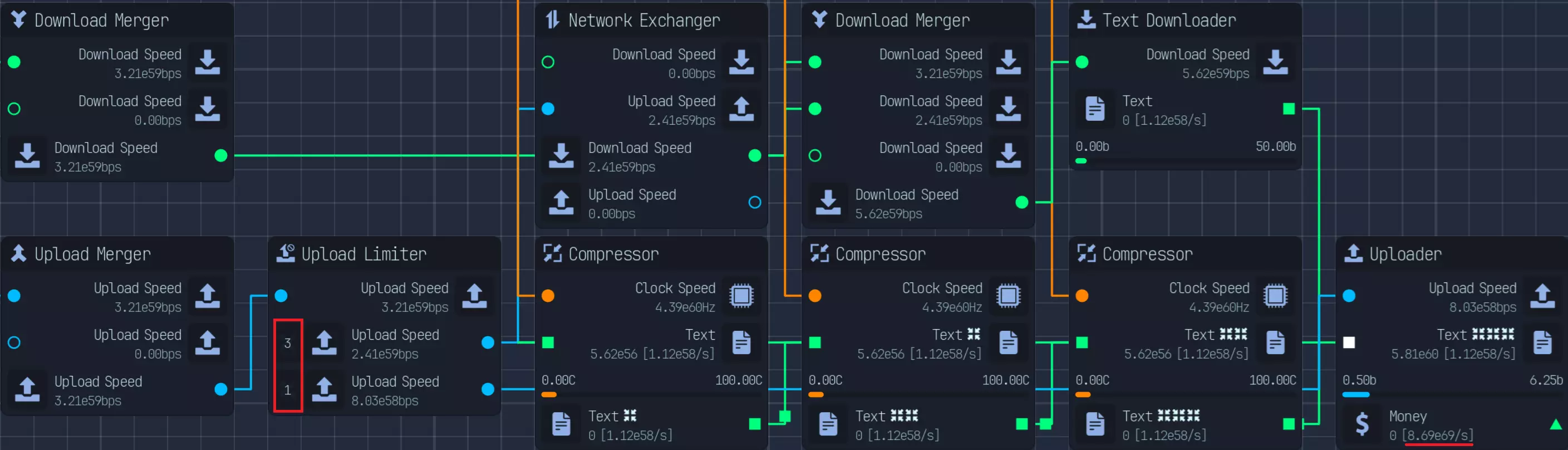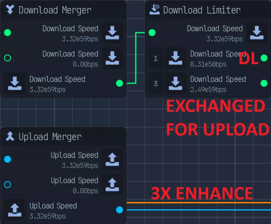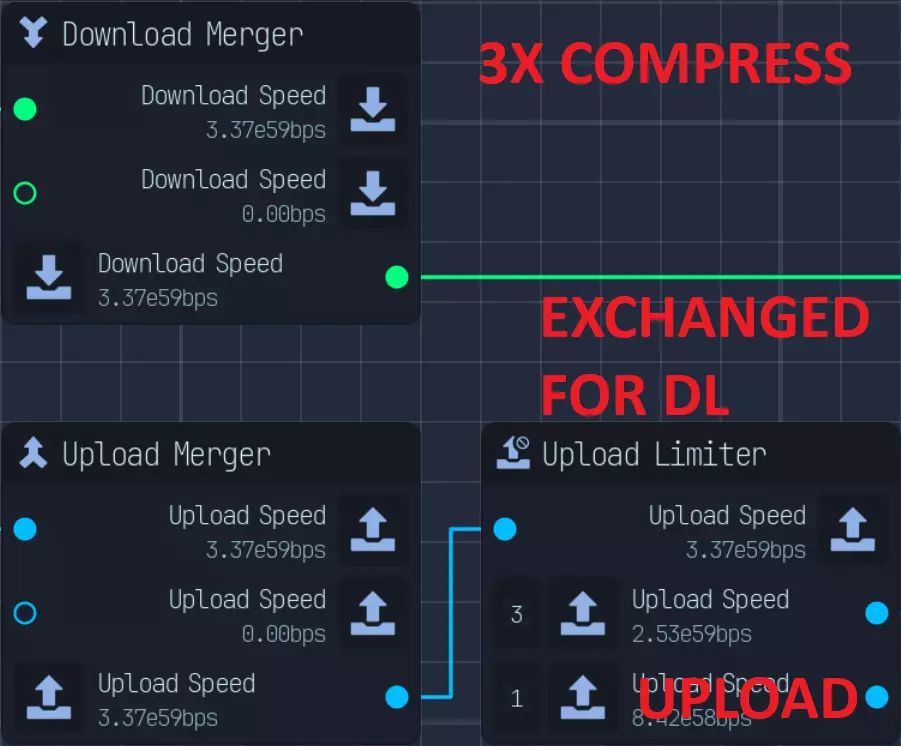 研究不需要上传,仅需要下载和CPU。如果我们仅使用90%的CPU和下载来获取收入,使用上传限制器时,我们会将100分配给主要收入,并预留1(0.99%)用于木马上传。 网络压缩与增强以及下载和上传的充分利用: 这两者的使用没有区别,因为网络总量相同。你只需要调整网络以匹配需求即可。 以下是3倍压缩与3倍增强的两个示例,两者拥有相同的下载、上传和CPU资源。 具体比例会根据你使用的是1倍压缩/增强、2倍还是3倍而有所不同。 1倍压缩=2:1,2倍=4:1,3倍=8:1。 增强的比例相同,只是顺序相反。为计算所需的正确比例,我们假设完整网络的下载(DL)+上传(UL)=10,下载:上传比例为1:1,为简便起见,我们使用5:5。 当前未做任何更改的比例为5:5,对于压缩,我们将上传拆分为3:1,合并5+3得到8,上传剩余1,从而实现8:1的比例。