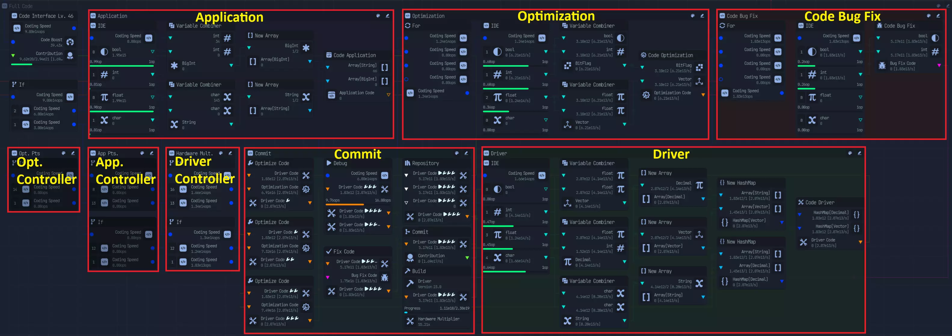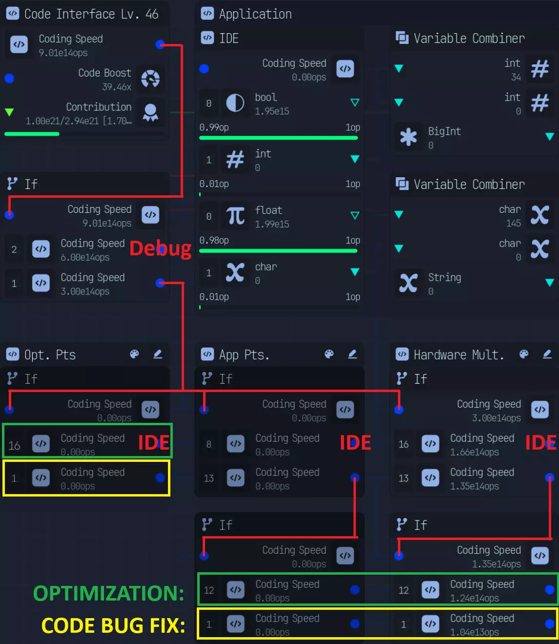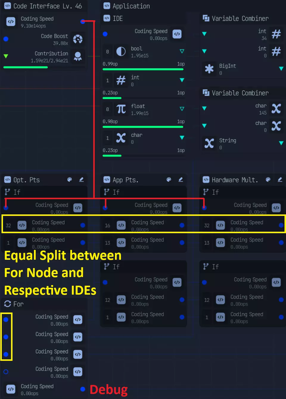 所有需要开启或关闭的功能均位于各自的节点组内。 编码界面和首个条件节点(If Node)不在此列,因为它们绝不能被关闭。 标签会标明其所属的节点组/功能。 (本节末尾有比率计算) 若你拥有最后4个能使变量速度翻倍的传送门升级(布尔值、整数、浮点数、字符型): 首个条件节点会将主编码速度按2:1分配。调试(Debug)无法享受2倍速度加成,因此实际分配比例会变为2:2,即1:1。 后续的分配比例如下: - **优化(Optimization)**:4*4 = 16:1(代码错误修复50%文件) - **应用(Application)**:8:13——8分配给应用程序集成开发环境(Application IDE),13分配给下一个条件节点。12:1 - 12 分配至优化(4*3),1 分配至代码错误修复 驱动程序:16:13 - 16 分配至驱动程序 IDE,13 分配至下一个 If 节点,与应用程序相同 0 个传送门升级