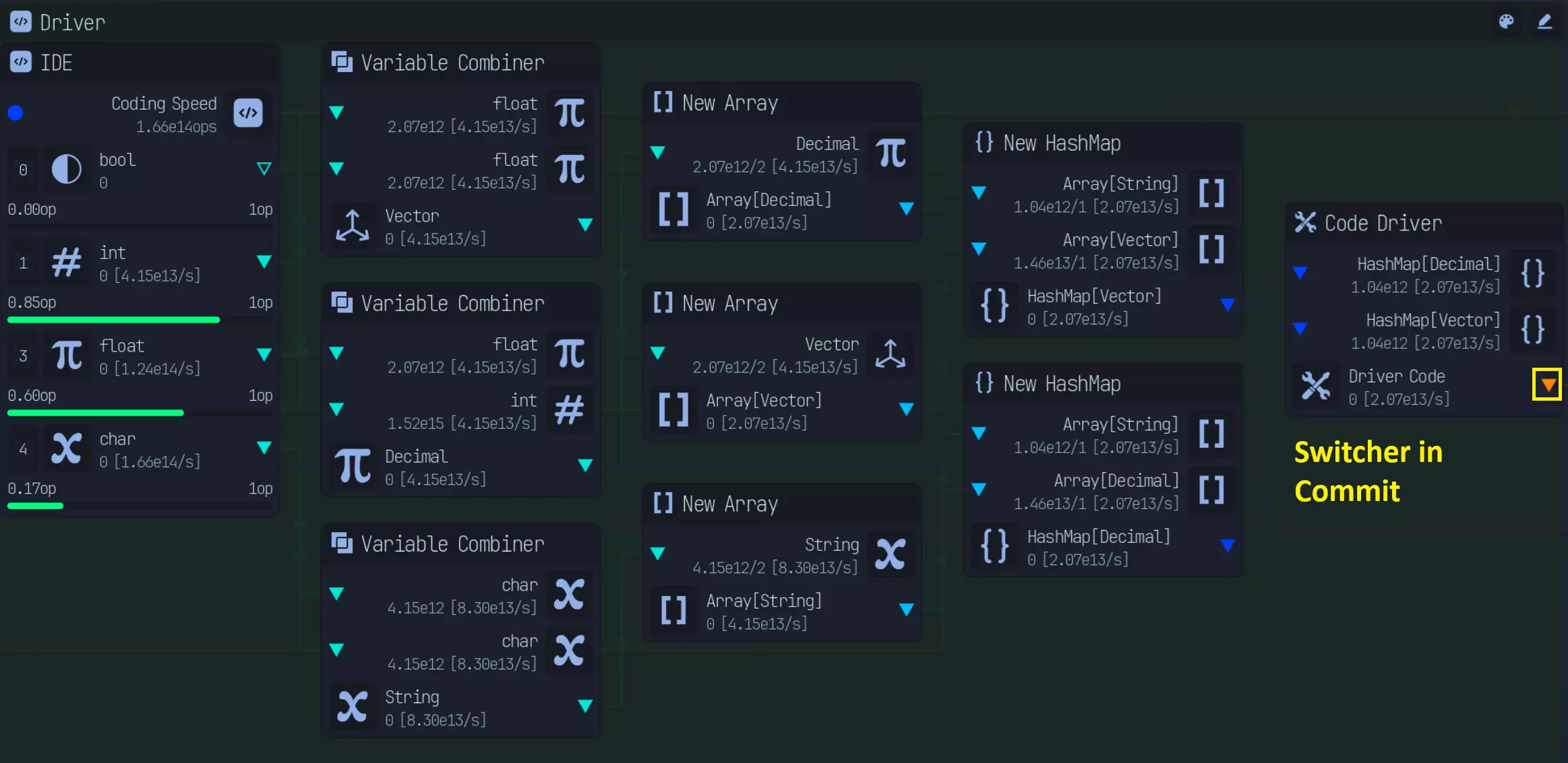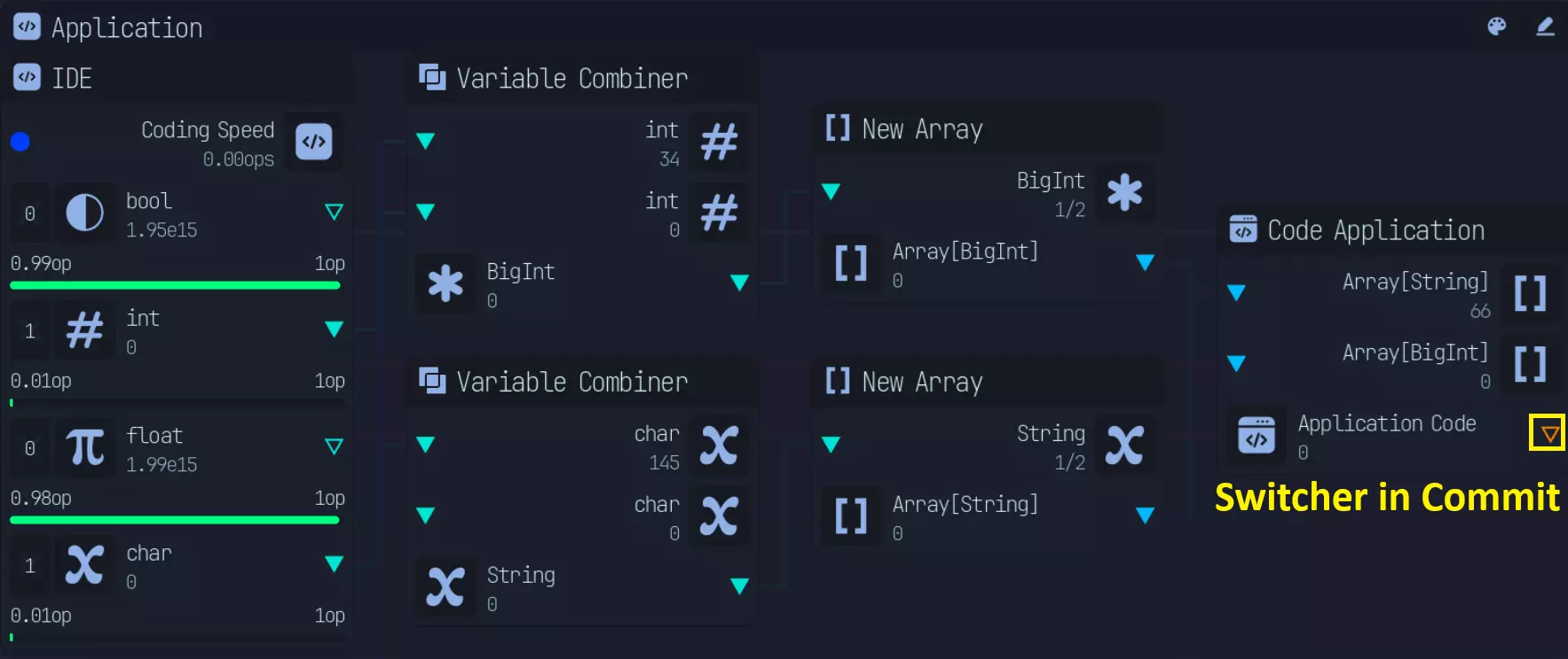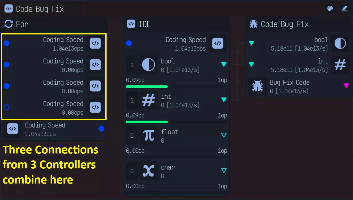 所有需要开启或关闭的功能均位于各自的节点组内。 编码界面和首个条件节点(If Node)不在此列,因为它们绝不能被关闭。 标签会标明其所属的节点组/功能。 (本节末尾有比率计算) 若你拥有最后4个能使变量速度翻倍的传送门升级(布尔值、整数、浮点数、字符型): 首个条件节点会将主编码速度按2:1分配。调试(Debug)无法享受2倍速度加成,因此实际分配比例会变为2:2,即1:1。 后续的分配比例如下: - **优化(Optimization)**:4*4 = 16:1(代码错误修复50%文件) - **应用(Application)**:8:13——8分配给应用程序集成开发环境(Application IDE),13分配给下一个条件节点。12:1 - 12 分配至优化(4*3),1 分配至代码错误修复 驱动程序:16:13 - 16 分配至驱动程序 IDE,13 分配至下一个 If 节点,与应用程序相同 0 个传送门升级
