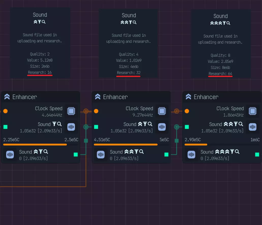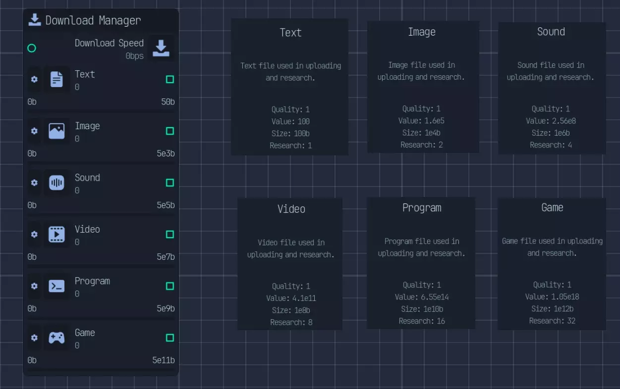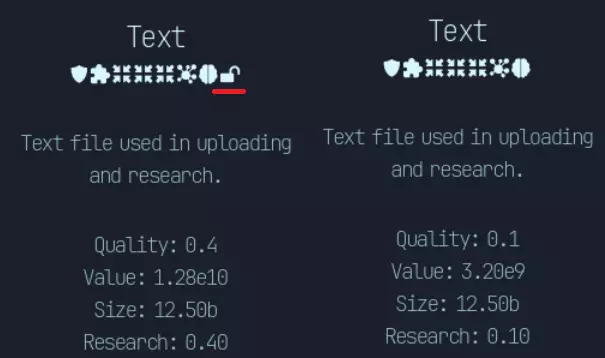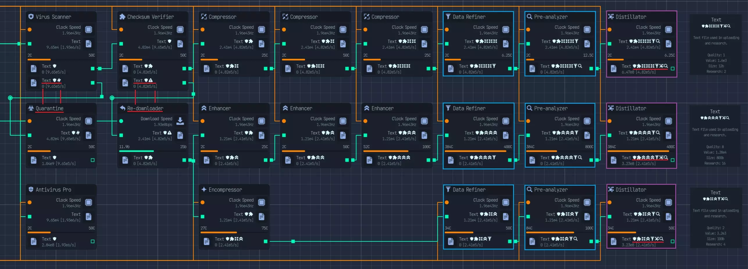 *自2.0版本更新后,此节点顺序不再生效* |节点|修正器|数值|大小|研究|备注| |----|----|----|----|----|----| |病毒扫描器|已扫描|4倍|||受感染修正器的50%| |隔离区|已感染|1/4倍|||需要额外步骤才能获得扫描修正器| |专业杀毒软件|/已扫描|4倍|||0%受感染修正器概率,但所需周期是病毒扫描器的2倍。所需总周期(2C)比病毒扫描器和隔离区的总和(1.5C) 校验和验证器 已验证 4倍 50%的损坏修正值 重新下载器 已损坏 1/10倍 1/5倍 可选择使用下载而非CPU时钟,你也可以跳过校验和,直接通过此功能来验证修正值 压缩器 已压缩 0.5倍 大小减少一半。通过升级,最高可压缩至3倍 增强器 已增强 2倍 2倍 2倍 2倍提升所有属性,包括上传速度、时钟速度,通过升级最高可增强至3倍 复合压缩器 增强/压缩 2倍 2倍 允许同时存在增强和压缩修正值。增强效果提升2倍,无2倍体积、上传量、周期 数据精炼器:精炼数据,效果提升2倍 预分析器:预分析数据,减少数据实验室研究时间2倍 蒸馏器:蒸馏数据,训练时神经元产量提升2倍 解密器:解密/加密数据,解密状态下效果为4倍,加密状态下为0倍,不可修改 木马:木马注入器,根据文件质量在上传时获得受感染计算机 AI:AI训练器/生成器,效果提升1000000倍,质量降低10倍 基础操作:研究/黑客/编码 研究: