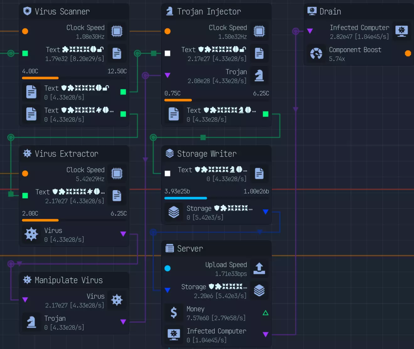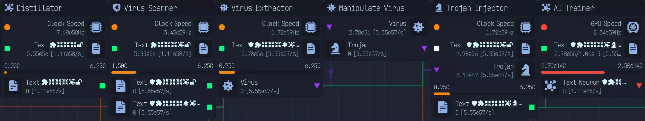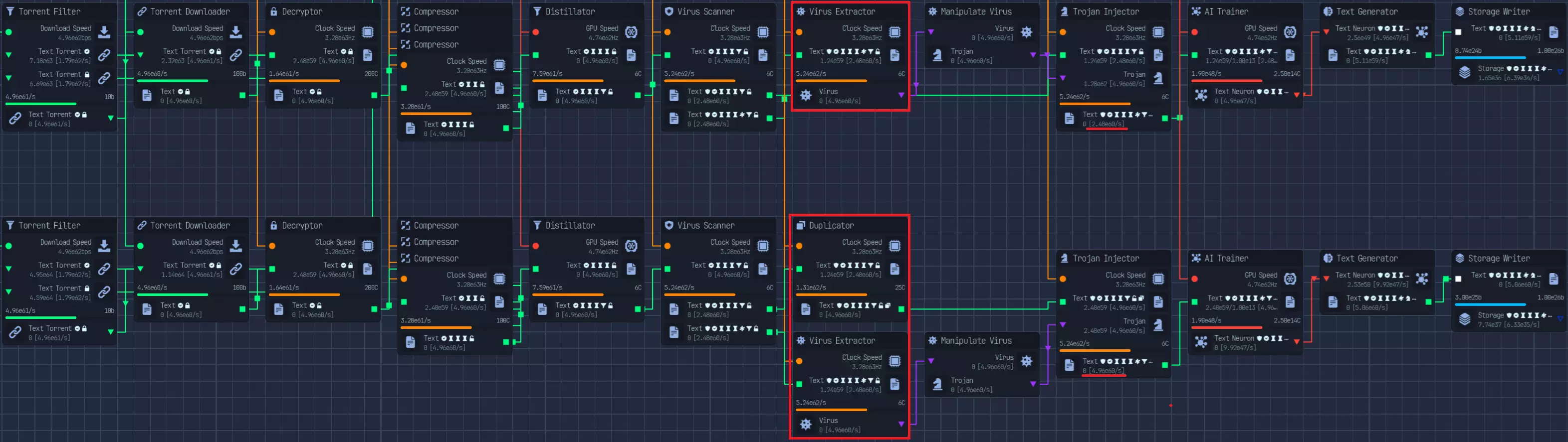*自2.0版本更新后,此节点顺序不再生效* |节点|修正器|数值|大小|研究|备注| |----|----|----|----|----|----| |病毒扫描器|已扫描|4倍|||受感染修正器的50%| |隔离区|已感染|1/4倍|||需要额外步骤才能获得扫描修正器| |专业杀毒软件|/已扫描|4倍|||0%受感染修正器概率,但所需周期是病毒扫描器的2倍。所需总周期(2C)比病毒扫描器和隔离区的总和(1.5C) 校验和验证器 已验证 4倍 50%的损坏修正值 重新下载器 已损坏 1/10倍 1/5倍 可选择使用下载而非CPU时钟,你也可以跳过校验和,直接通过此功能来验证修正值 压缩器 已压缩 0.5倍 大小减少一半。通过升级,最高可压缩至3倍 增强器 已增强 2倍 2倍 2倍 2倍提升所有属性,包括上传速度、时钟速度,通过升级最高可增强至3倍 复合压缩器 增强/压缩 2倍 2倍 允许同时存在增强和压缩修正值。增强效果提升2倍,无2倍体积、上传量、周期 数据精炼器:精炼数据,效果提升2倍 预分析器:预分析数据,减少数据实验室研究时间2倍 蒸馏器:蒸馏数据,训练时神经元产量提升2倍 解密器:解密/加密数据,解密状态下效果为4倍,加密状态下为0倍,不可修改 木马:木马注入器,根据文件质量在上传时获得受感染计算机 AI:AI训练器/生成器,效果提升1000000倍,质量降低10倍 基础操作:研究/黑客/编码 研究: