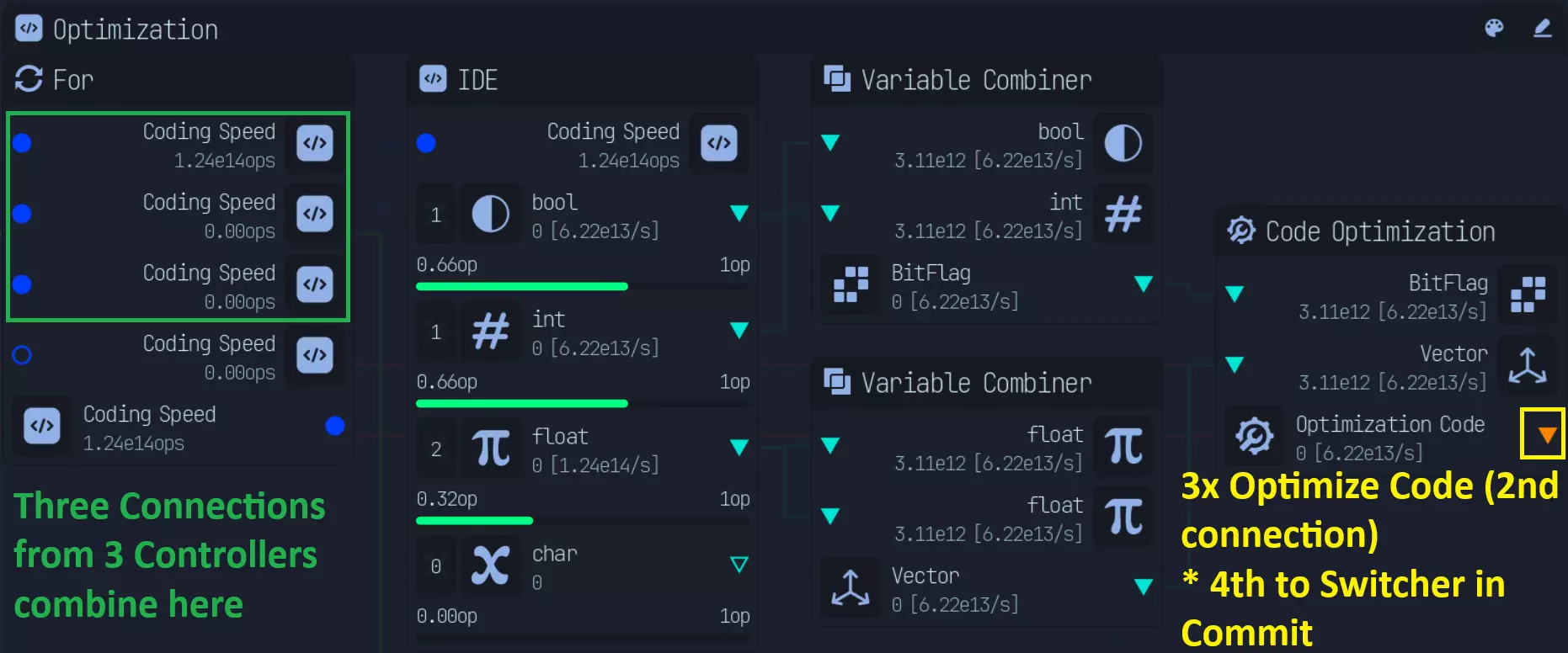 优化模块包含一个For节点,该节点会整合所有控制器的编码速度,因为优化代码(Optimize Code)将与全部3个代码配合使用。 IDE比例:1:1:2:0 优化模块的输出会平均分配给切换器(若需要)和3个优化代码(Optimize Code)。 应用程序