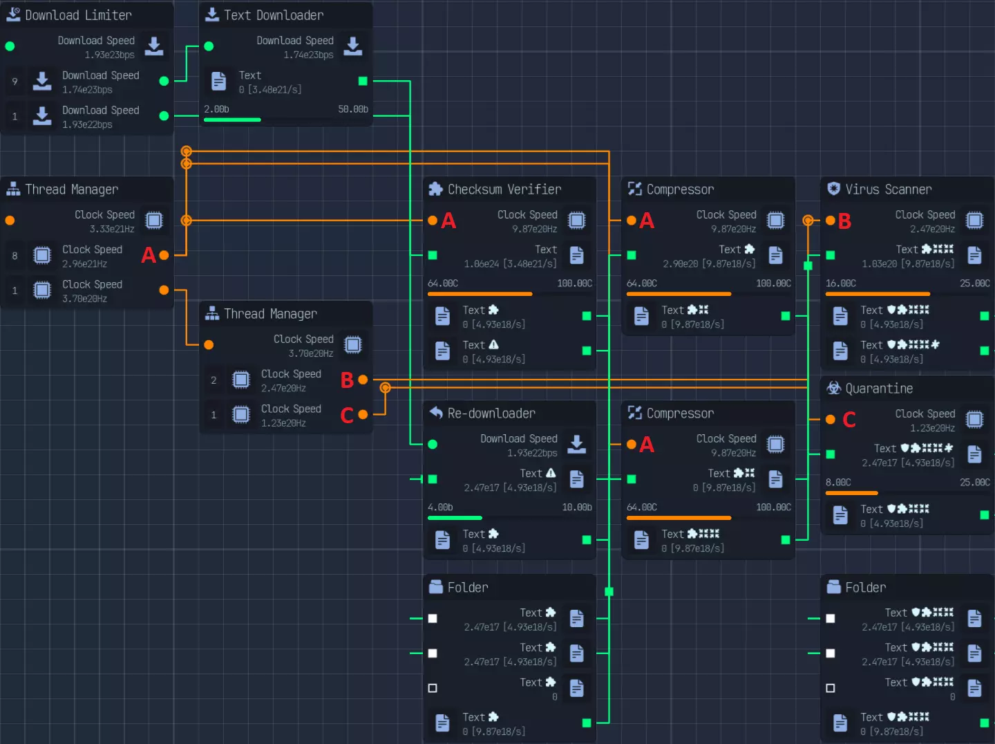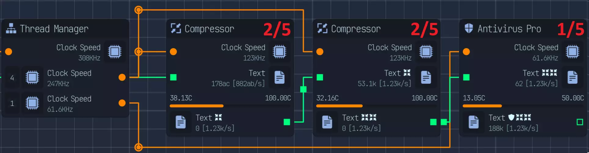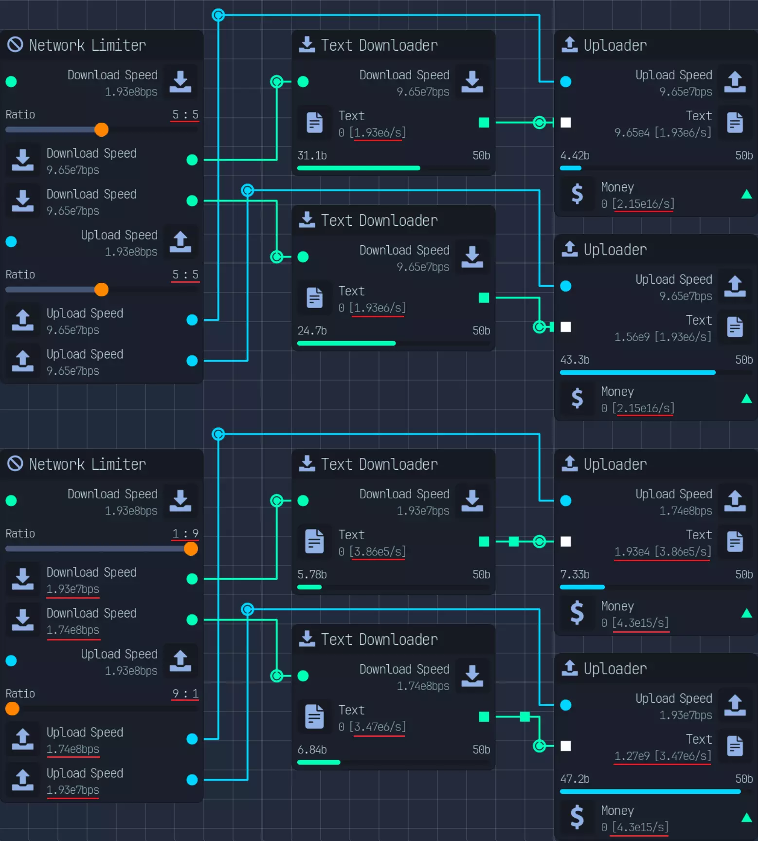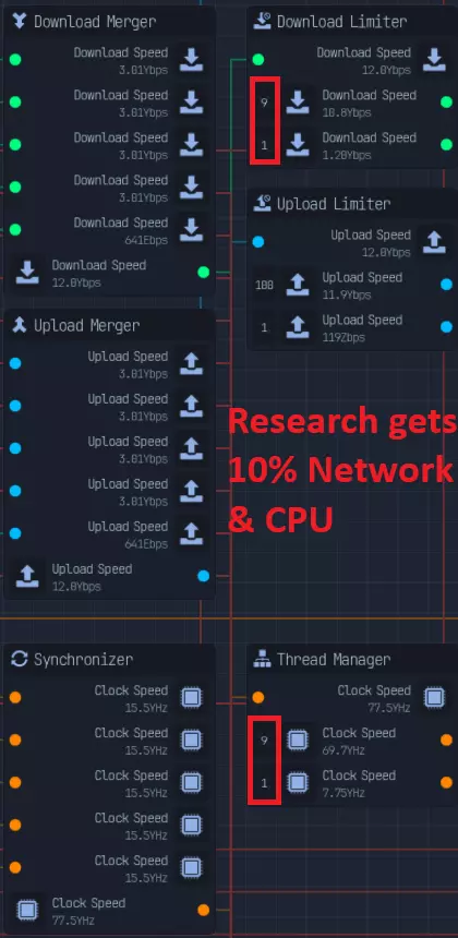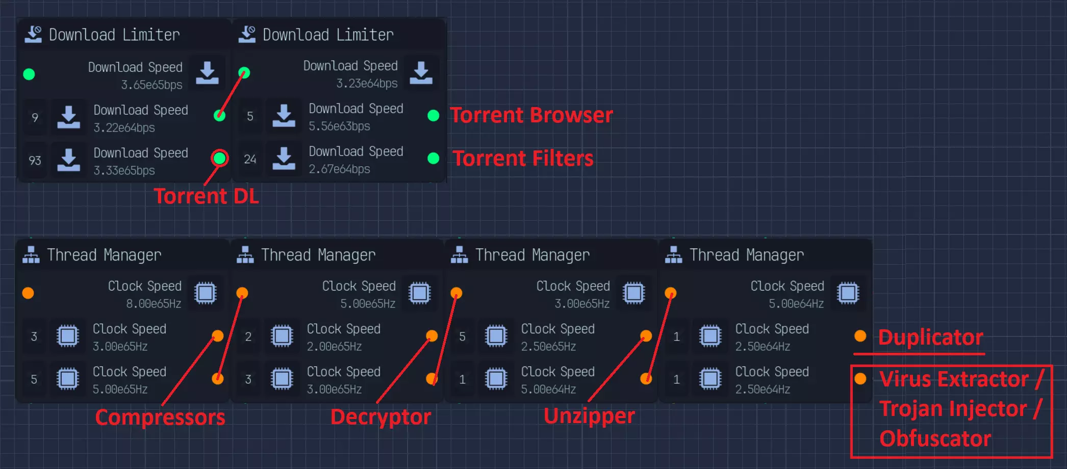 已更新网络、CPU连接 浏览器和过滤器使用相同的下载速度,因此最后的下载器限制器实际上并不需要。 计算: 下载: - 种子浏览器:5次/每次10b = 50b - 种子过滤器:4×6次/每次10b = 240b - 种子下载器:6次/每次500b = 3000b(3kb) 得出290:3000,计算结果约为290/3000 = 0.09667 鉴于此数值比例在限制器中不可接受,我们需要进行简化。 部分替代方案:3:30、1:10、5:51 我能得到的最接近的比例是9:93 = 0。09677 CPU: 解压缩器 = 250 解密器 = 200 压缩器 3倍 = 100 / 总计300 复制器 = 25 病毒提取器 = 6 木马注入器 = 6 混淆器 = 6 250 + 200 + 300 + 25 + 6 + 6 + 6 = 793C 为简便起见,合并病毒提取器 + 木马 + 混淆器 = 25 我们按800C计算,以25为增量 最终比例为10:8:12:1:1 10 + 8 + 1 + 1 = 20 12(3倍压缩器):20(其余部分)= 首次分配比例3:5 然后从5中分配解密器(200):2:3 接着从3中分配解压缩器(250):5:1 最后将复制器(25)分配给病毒、木马和混淆器(18):1:1 最后一次连接会浪费7,但占比不到1%,损失不大。