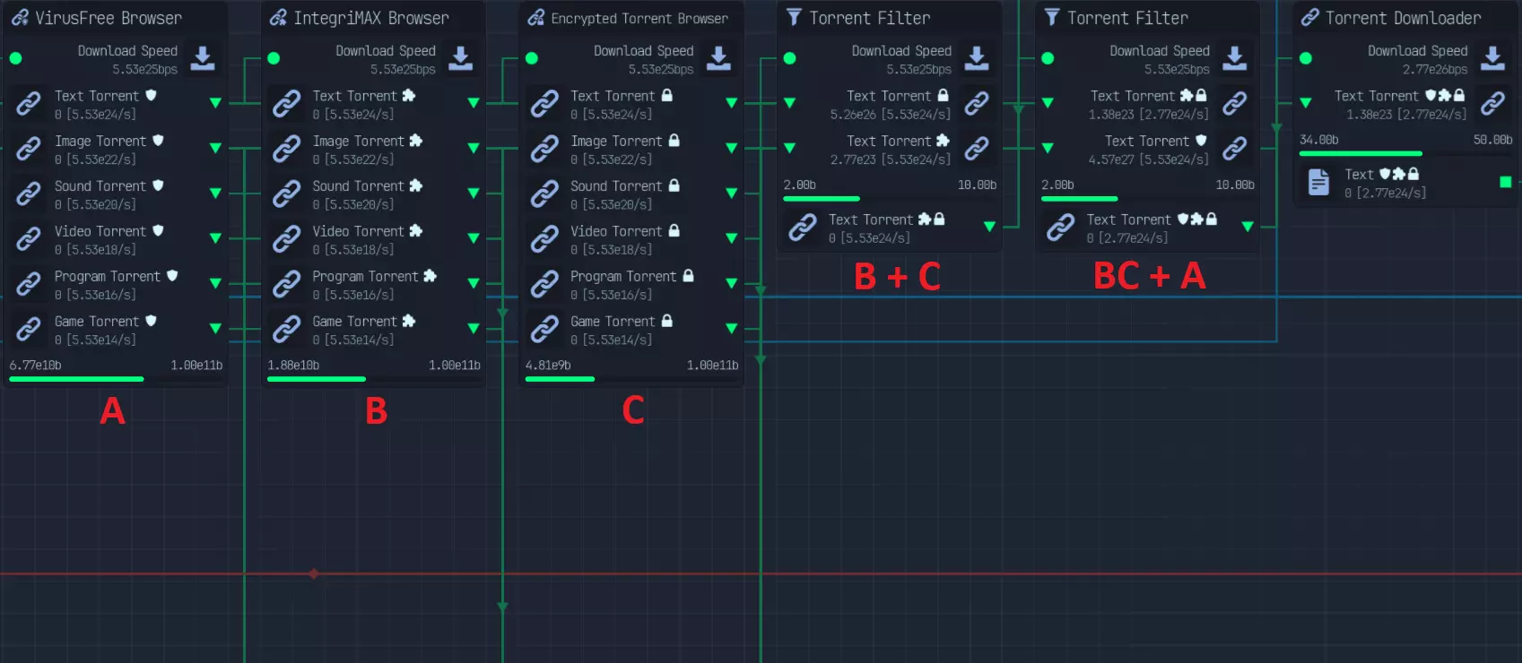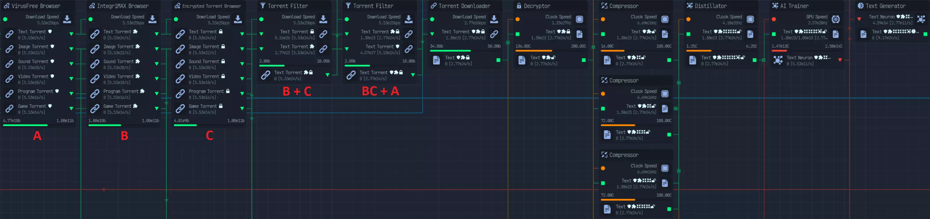 在2.1版本更新中,我使用了5种种子浏览器: - VirusFree - IntegriMax - Zipped - Infected - Encrypted 随着混淆器(Obfuscator)的引入,我们不再需要对文件进行病毒扫描,并且可以在文件上保留已扫描的模组,即便模组已被扫描,仍能移除受感染文件。 压缩文件(Zipped files)可提供10倍文件容量。例如,若使用文本文件:5个种子在浏览器上需消耗50b,过滤器需40b,下载(DL)需500b(压缩后为1kb的一半大小),总计590b。此时我们需要10倍下载量,即1kb,同时压缩节点(zip node)需500C(3倍压缩则为53C),而两种情况都仍需解压节点(Unzip node)。仅下载方面,使用压缩种子可提升96%的效率。此外,使用压缩节点会使CPU周期增加15%。