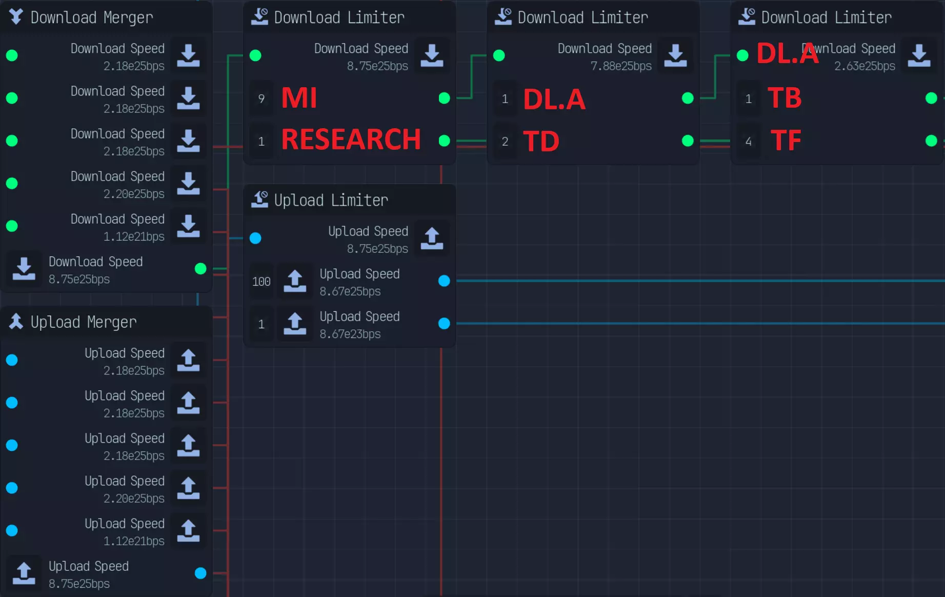 IMGUR链接[imgur.com] 管理网络和处理器会变得稍微复杂一些。 我们将从硬件及其管理开始: 网络时常会出现故障,因为我们也在使用种子下载。 首先,我们会抽取10%用于研究和木马程序,90%作为主要收入(MI)。 在主要收入中,按2:1的比例分配,1份流向另一个下载限制器(DL.A),另外2份流向种子下载器(TD)。 在下载限制器(DL.A)中,按4:1的比例分配,1份流向种子浏览器(TB),另外4份流向种子过滤器(TF)。