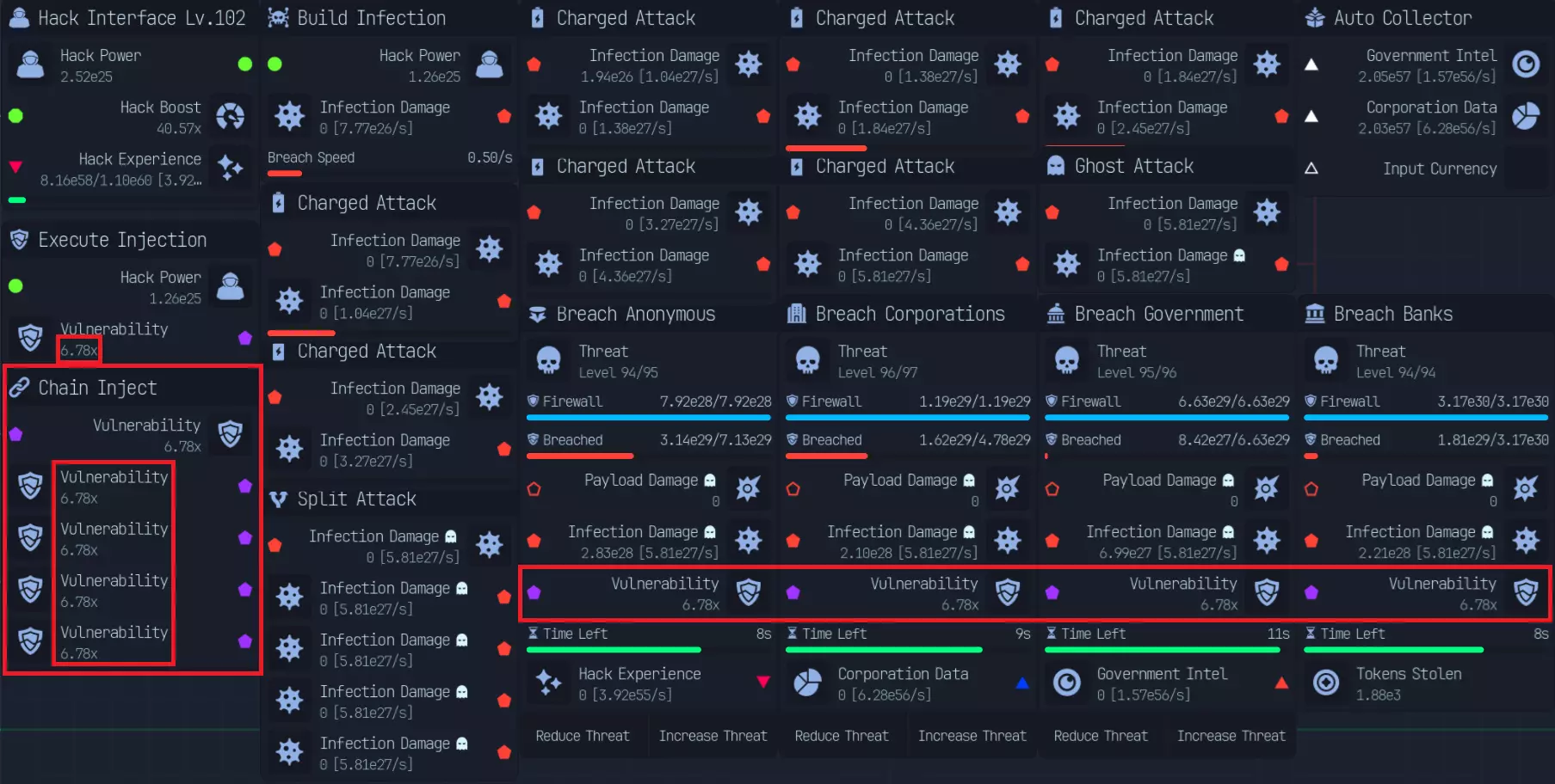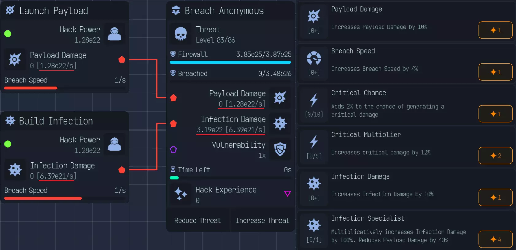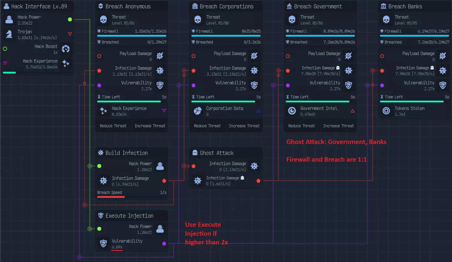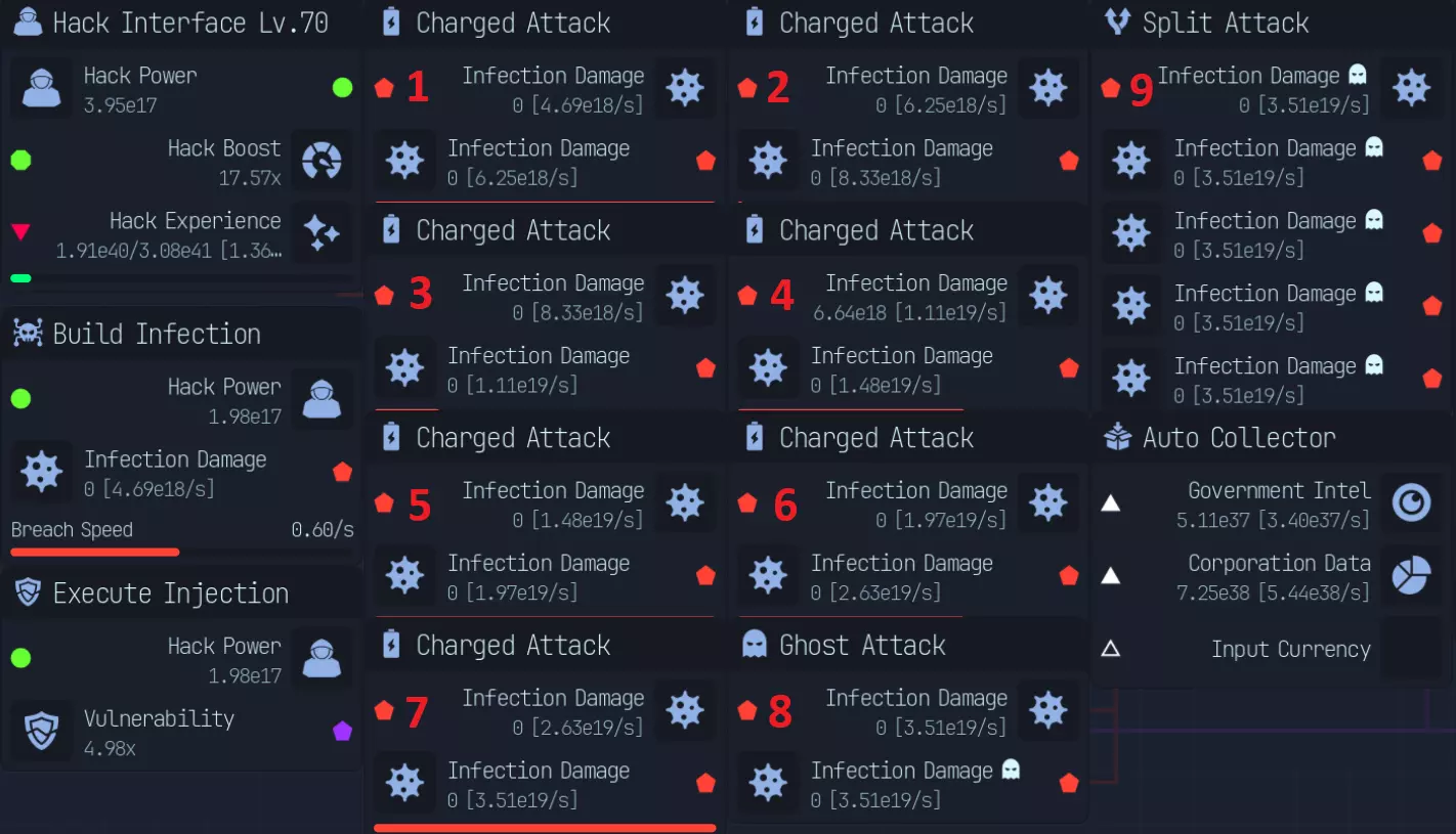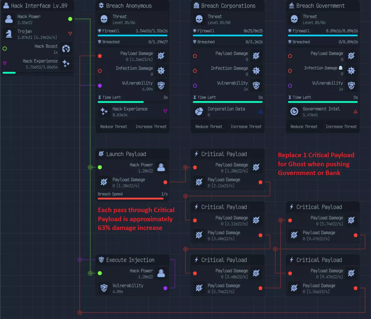 黑客与木马 黑客与入侵: 有多种推进方式,包括: - 常规载荷伤害 - 暴击载荷 - 感染伤害 一些关键要点: - **执行注入的威力非常强大** - **基础感染伤害与载荷伤害的比例为1:2** - **感染专家升级后,感染伤害与载荷伤害的比例变为1:1** - **暴击载荷可以叠加** - **暴击载荷初期成本很高,需要20点才能达到暴击率和暴击伤害上限** - **10%伤害加成几乎总是最佳选择** - **入侵速度有助于稳定暴击载荷构筑** - **理论上,只有在入侵窗口内能够多造成一次攻击时,入侵速度才有用。具体取决于构筑类型,例如**需要5秒或10秒的突破时间和突破速度来计算突破速度是否更优。 破坏、潜行攻击对每种构筑都至关重要。 匿名者和企业(的防火墙)大约增加2倍(难度),政府和银行(的防火墙)由于防火墙密集,大约增加4倍(难度)。 我尚未进行大量测试来确定哪种方法最佳,但我会分享一些关于每种构筑的想法。 **Payload Damage(载荷伤害)** - 经济实惠,效果显著 - 缺乏成长性 - 优秀的新手构筑 **Critical Payload(暴击载荷)** - 启动成本高,至少需要20点才能开始构筑 - 成长性最佳(预期伤害为每个节点1.33,总计4)16点预期伤害提升 毕业构筑 感染伤害:成本较高,但不及暴击载荷,至少需要4点,理想情况是配合满点潜行攻击 良好的成长性(累积伤害) 推荐中期构筑 构筑要点:腐败(Spoil)为核心 若走感染路线,需感染专家 优先提升10%伤害