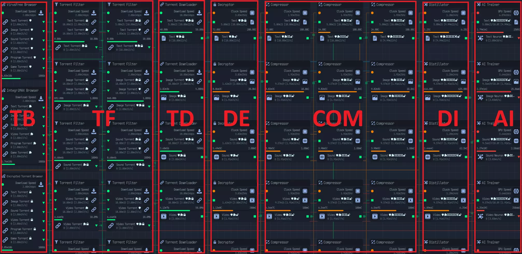 符号 节点 TB 无病毒/完整性最大化/加密种子浏览器 TF 种子过滤器 TD 种子下载器 DE 解密器 COM 压缩器 DI 蒸馏器 AI AI训练师 中期游戏:用于研究的图纸