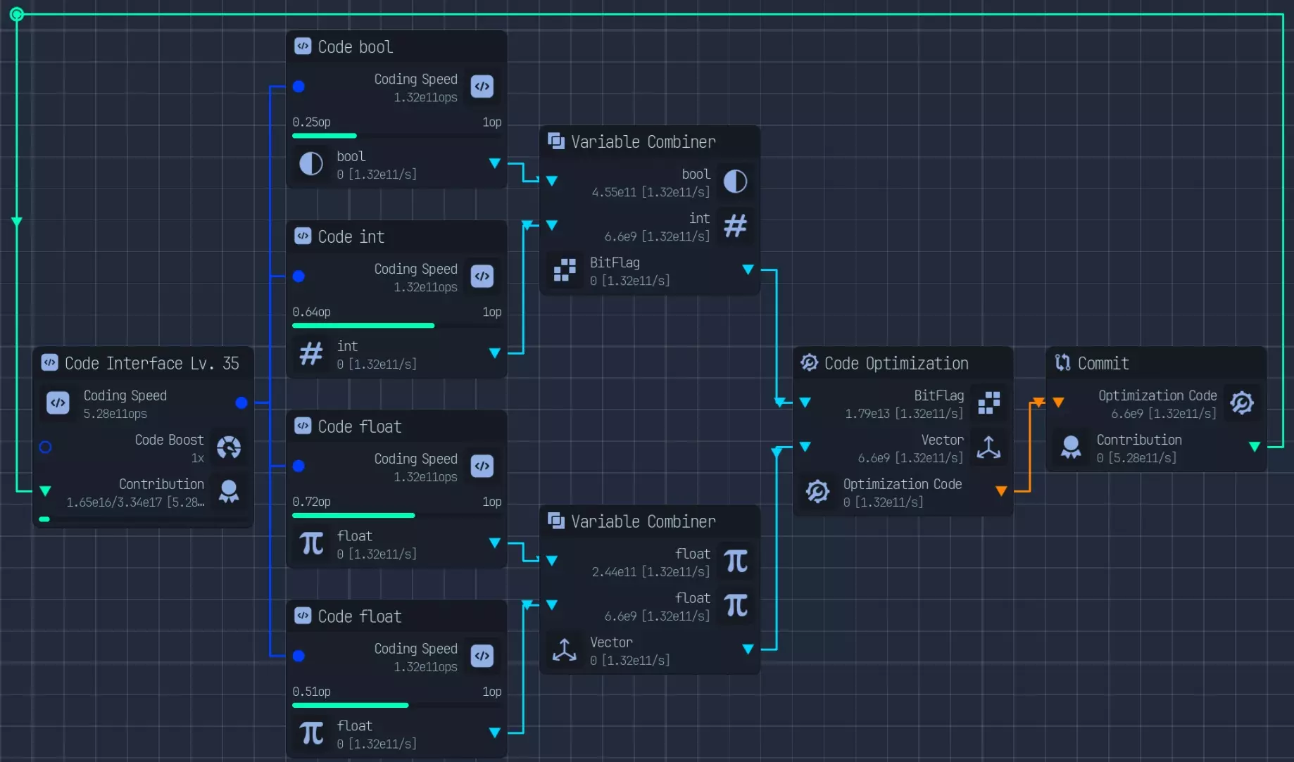 这里是“提交”(Commit)节点组,它是用于放置最终修饰器的主要节点组,用于提升“编码界面”(Coding Interface)等级和构建代码(Building Code)。 “切换器”(Switcher)需要重新连接到你正在推送的任何代码。如果要提升编码界面等级,“驱动程序”(Driver)似乎能产生最佳数值。 “驱动程序”(Driver)被用作“提交”(Commit)的主要代码,因为它具有最高的贡献值。 如果“驱动程序”(Driver)暂不可用于提交,你可以将连接切换到任何可用的代码,并且在本指南的后续部分,将展示如何计算这些代码的比例。从第一个IF节点开始,我们按2:1的比例分流——2份进入调试(Debug),1份进入第二个IF节点。 第二个IF节点按16:13的比例分流——16份进入节点驱动程序(Driver For Node,如图所示),13份进入第三个IF节点。 第三个IF节点按12:1的比例分流——12份进入节点优化(Optimization For Node),1份进入代码错误修复(Code Bug Fix)。 第一个代码优化(Optimize Code)节点的第一个连接来自驱动程序(Driver)。 在所有3个代码优化(Optimize Code)节点中,第二个连接均与优化(Optimization)相连。 根据需要关闭提交(Commit)或构建(Build)。 编码速度比率 首先确定计算参数: 1运算(ops)= 1变量(var) 调试(debug)= 代码的总运算数 假设1个驱动程序代码=1,那么每一步都乘以2,因为每一步都需要双倍的运算量。反向推导:1 个驱动代码 × 2(哈希表)= 2,2×2(数组)= 4,4×2(变量容器)= 8,8×2(IDE(变量))= 16。 公式如下:2^(x-1),其中 x = 处理步骤数。 优化过程同理,但有 3 个优化代码,因此需要将结果乘以 3。优化有 3 个步骤:2^(3-1) = 2² = 4,乘以 3 后结果为 4×3 = 12。 代码错误修复:2^(2-1) = 2¹ = 2。 调试仅将错误修正率提升 50%,因此 2 × 0.5 = 1。调试与代码的运算量为 1:1 比例,但如果拥有传送门升级,除调试外的所有内容都乘以 2。这意味着优化变为 6×3 = 24,代码错误修复变为 2,驱动变为 32。因此,我们必须先按 2:1 拆分,算上升级后实际为 2:2 或 1:1 比例。编码:优化升级 优化点数是游戏进程中的重要组成部分,获取初始点数并不需要花费太多时间。 以下是我在使用优化点数进行升级时的优先选择列表。 由于这些点数获取难度不高,因此并未通过实际计算或分析来确定最佳升级顺序。压缩下载/上传 压缩/增强/压缩(取决于用于收益的类型) 增强(用于研究;如尚未选择) 学习(仅适用于AI角色) 解密(如使用种子文件) 种子浏览与筛选(包括预分析、已验证、扫描(如需)) 数据精炼器 蒸馏、扫描器、木马(优先级极低,因为这些应在压缩之后进行,因此周期已非常短) 门户