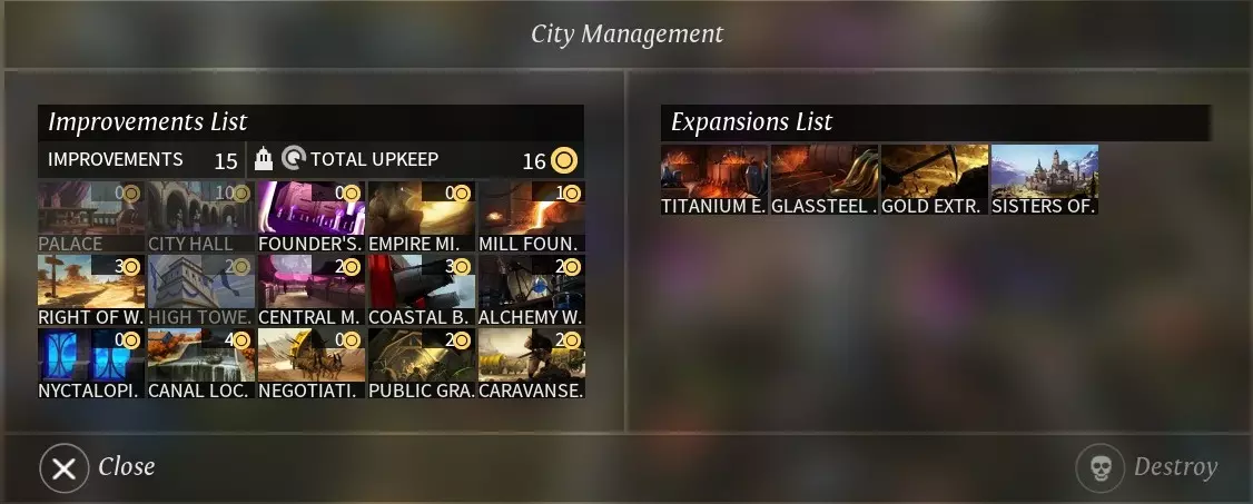 一城区附近若存在4个或以上城区,此城区就能升级,升级后的城区能提供更多产出,且提供正面的城市拥护度加成。 城区一旦建好不能拆除。 摧毁城市 如果对城市放置位置不满意或其他原因要摧毁当前城市的,可以在生产面板选择**盐化土地(salt the earth)**。