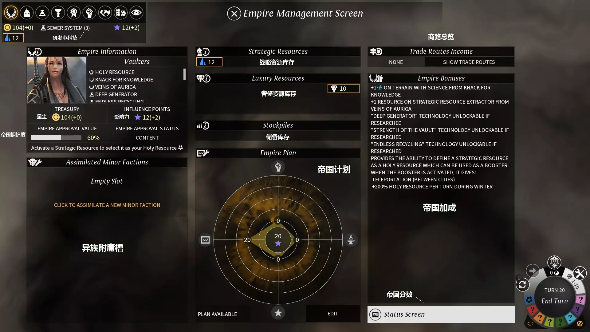 研发中科技:显示目前研究中的科技及所需回合数。 星尘:游戏货币,主要用于维护军队、建筑,也可用于加速生产、市场购买。若星尘赤字,单位和英雄将会被强制卖出,改良建筑会被拆毁。 影响力:主要用于开启帝国计划、进行外交及使用一些特殊的阵营技能。帝国拥护度(empire approval):帝国拥护度由帝国中各个城市的拥护度平均而得,分为5个等级: 0-10 反叛(rebellion):-50%科研产出,-50%星尘产出; 11-39 不安(unhappy):-20%科研产出,-20%星尘产出; 40-60 满意(content):无效果; 61-89 快乐(happy):+15%科研产出,+15%星尘产出; 90-100 狂热(fervent):+30%科研产出,+30%星尘产出。 异族附庸槽:花费影响力将被驯服且处于帝国控制区域的异族附庸,获得加成及允许训练该族兵种。 战略资源库存:显示战略资源的库存数量。 奢侈资源库存:显示奢侈资源的库存数量,可在该面板激活相应的奢侈资源获得加成。帝国计划(empire plan):查看或修改帝国计划。 商路总览:查看商路的详细信息及收入。 帝国加成:查看帝国受到的各种影响。 帝国分数:查看或对比与其他帝国的差距及获取胜利的距离。 建立城市与管理 城市建立 只要军队中有殖民者(settler),你就可以在未占领区域使用建立城市选项。