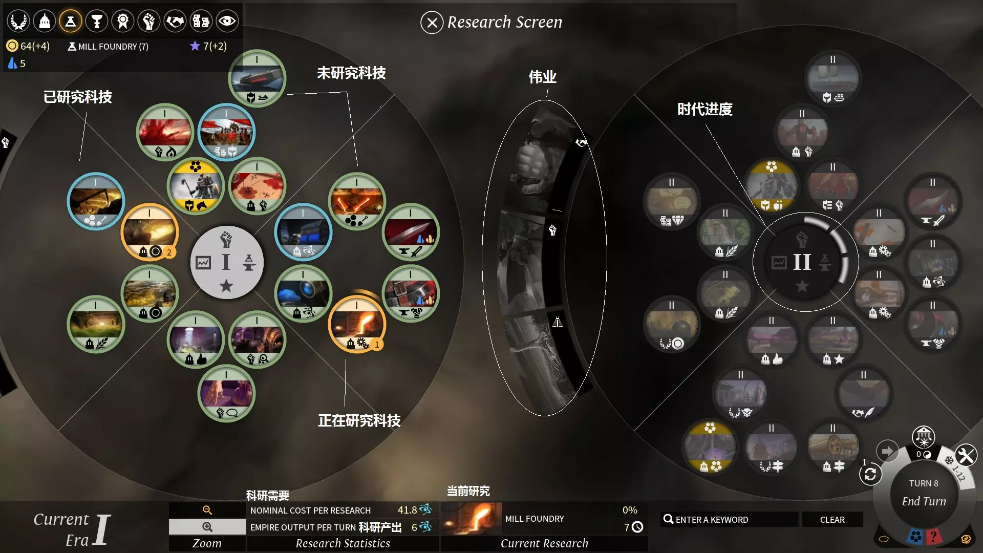 科技圈中蓝色为已研究科技,黄色为正在或将要研究的科技。 科技圈上半部分为军事类科技,左半部分为经济与人口科技,右半部分为工业与科研科技,下半部分为帝国与扩张科技。 科技圈左侧为传奇伟业(legendary deed,DLC1)。 当前时代的所有科技所需的基础科研点相同,但每研究一项科技,所有其他科技的需求都会增加。 ### 时代 每研究9项科技就会将游戏推入新时代。科技树未达到新时代的玩家不能研究新时代的科技,但可以享受新时代的效果及完成新时代的传奇伟业(DLC1)。 **注意**:由任务获取但本身不处于科技树上的科技不计入时代进度,任务获取且本身处于科技树上的科技则计算在内。各时代效果: 第一时代,重生时代(Age of Rebirth):初始时代。 第二时代,荣耀时代(Age of Glory):可制作2阶铁制(iron)装备;新招募单位默认2级;开启第二层帝国计划。 第三时代,启蒙时代(Age of Enlightenment):可制作3阶铁制装备;新招募单位默认3级;在地图上显示新的战略与奢侈资源;开启第三层帝国计划。 第四时代,工业时代(Age of Industry):可制作1阶星尘(dust)装备;新招募单位默认4级;在地图上显示新的战略与奢侈资源;开启第四层帝国计划。 第五时代,英雄时代(Age of Heroes):可制作2阶星尘装备;新招募单位默认5级。第六时代,终末时代(End of Ages):可制作3阶星尘装备;新招募单位默认6级。 任务系统 任务界面