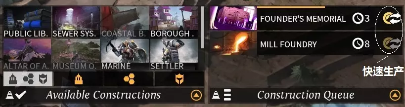 在生产面板中可生产的内容有:改良建筑(improvement)、扩张建筑(expansion,需摆放在区域内的建筑,城市受到围城影响时不能建造)、储备物(stock,需科技研究)和军事单位。 生产队列可以通过左键拖拽排列生产顺序,点击生产项目可取消生产,点击右方星尘图标可以消耗星尘快速生产。 执政官与委任