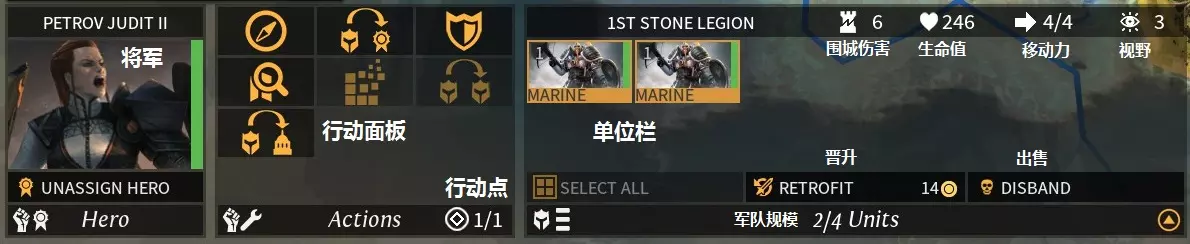伤害:单位能造成的伤害。 等级:单位强度和升级所需经验随等级提高,普通单位除每回合默认获得一点经验外,也可从战斗中获取经验;英雄单位的经验来源则更为多样。普通单位最高可升至10级,英雄单位无等级上限。 特性:单位所具备的特殊属性,来源于兵种模型本身及装备。 维护费:单位每回合需要消耗的星尘。 军事界面:用于查看和管理所有军队的界面。
