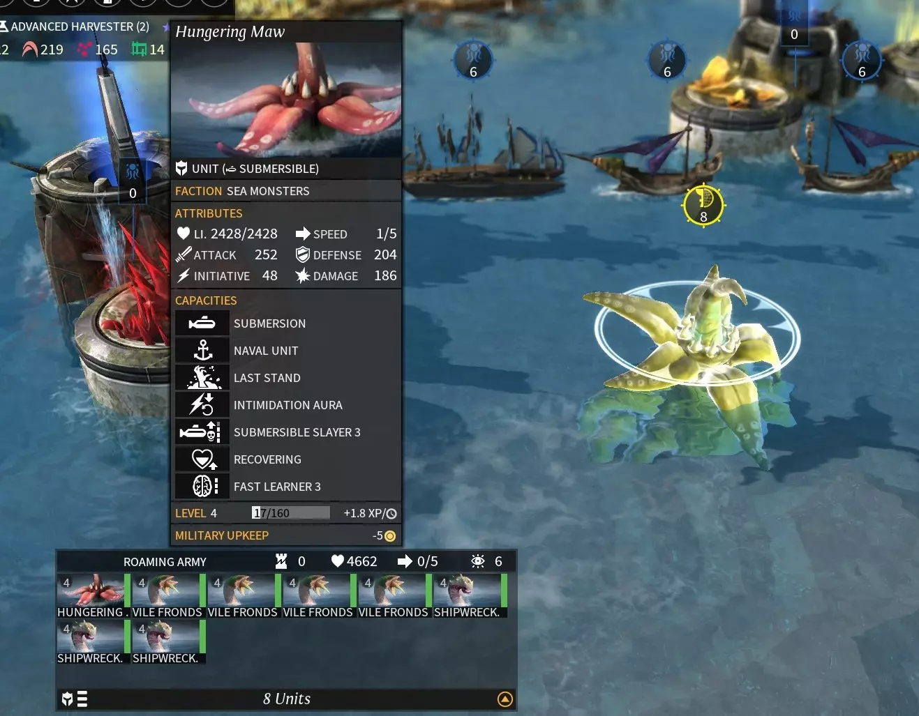 吞噬者(vore,护卫舰) 兵种特性: 海军单位:无法参加陆地战斗 龟壳:战斗中受到攻击时防御力提升50%,效果持续整场战斗 快速变异:可以随时更新装备