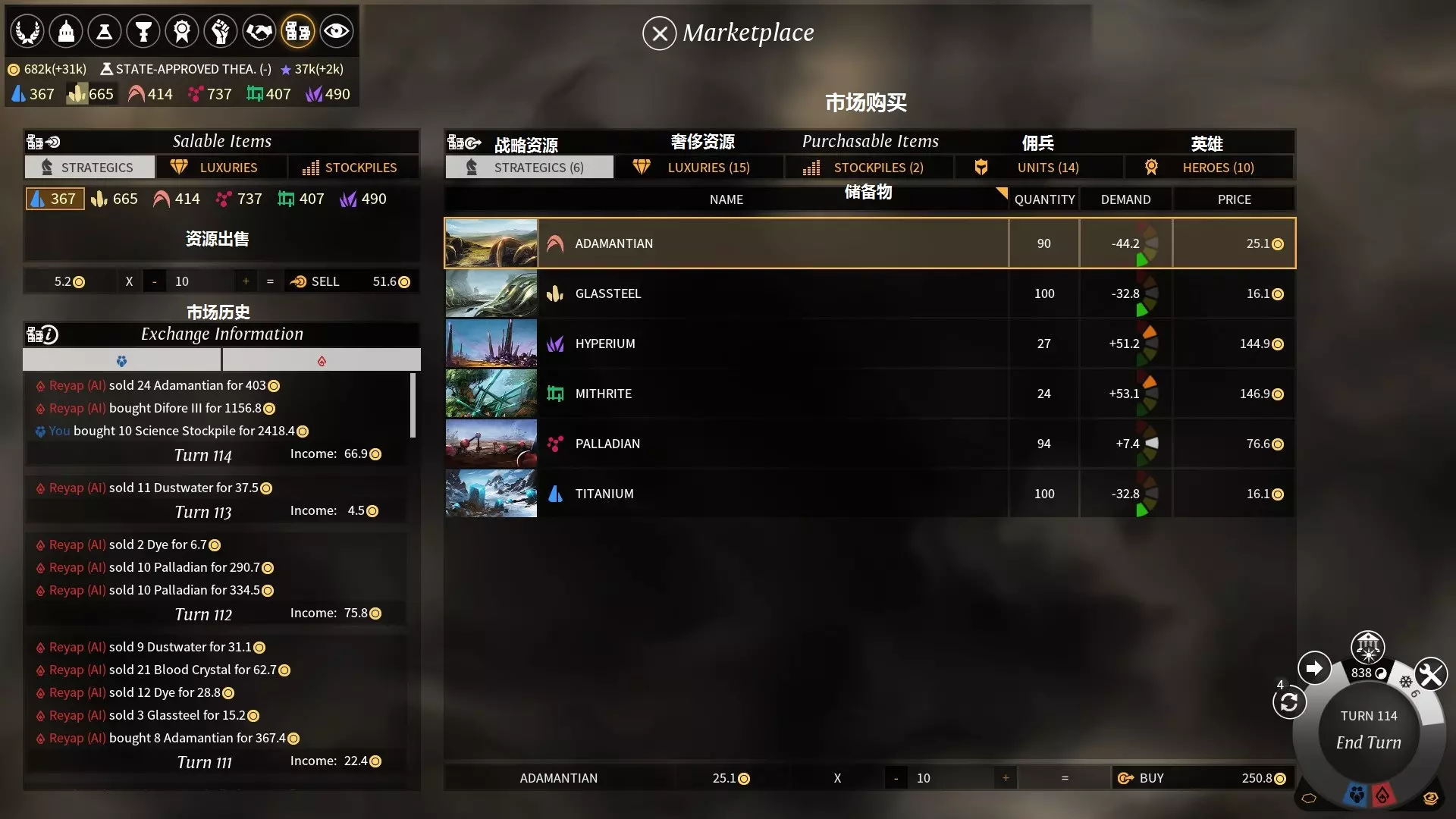 市场用于招募雇佣兵、英雄,以及买卖战略和奢侈资源储备物。 招募功能需要“佣兵市场”科技。佣兵和英雄的价格、佣兵装备以及他们的初始等级,都会随着游戏回合数的增加而提高。 买卖资源需要“帝国货币(imperial coinage,第二时代)”科技。可交易的资源会随时代逐步开放,而用于买卖资源的星尘数量也会随游戏回合数增加。 买卖资源的单位为1至10。资源价格会根据买入或卖出行为相应提高或降低,且价格设有上下限。 当前佣兵、英雄和资源的价格高低,通过从绿色到红色的颜色变化来表示。