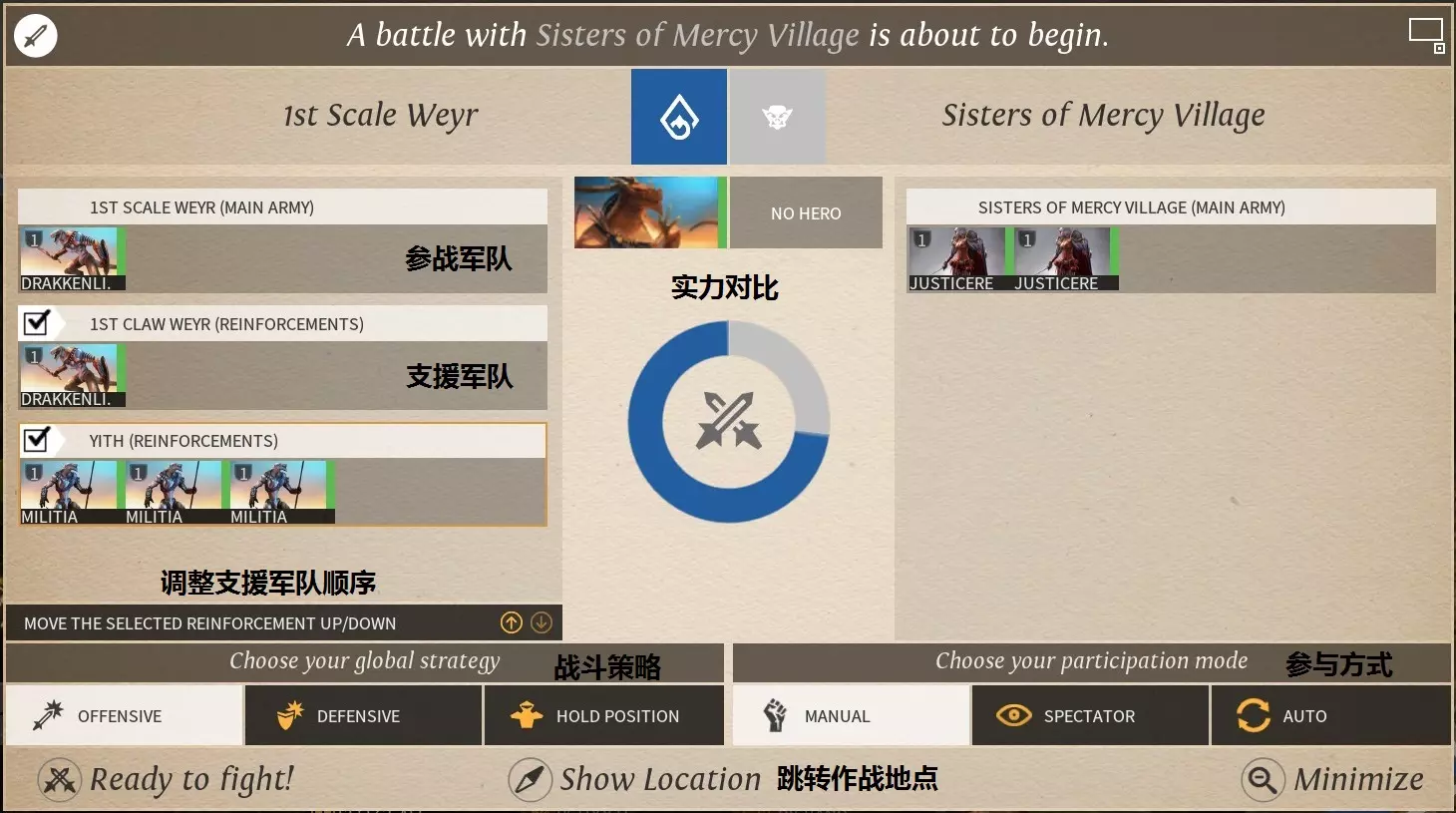 在战斗界面中可设置作战策略,该策略也能在战斗中进行个别调整: - **进攻性(offensive)**:无其他指令时主动发起进攻。 - **防御性(defensive)**:无其他指令时主动前往防御位置。 - **坚守位置(hold position)**:保持原地不动,自动攻击范围内的敌人。 军队进入战斗后,附近的友方(己方及联盟方)军队可进行支援。战斗中,除主要参战军队全数上场外,支援军队每回合按顺序默认有2个单位进入战场。支援军队可以有多支,且可手动调节上场顺序。 战斗过程支持手动操作、观看以及自动生成,但手动进入战斗后不支持自动计算战斗结果。 军队受到攻击时可选择撤退(retreat),撤退后将损失50%的最大生命值和行动点。