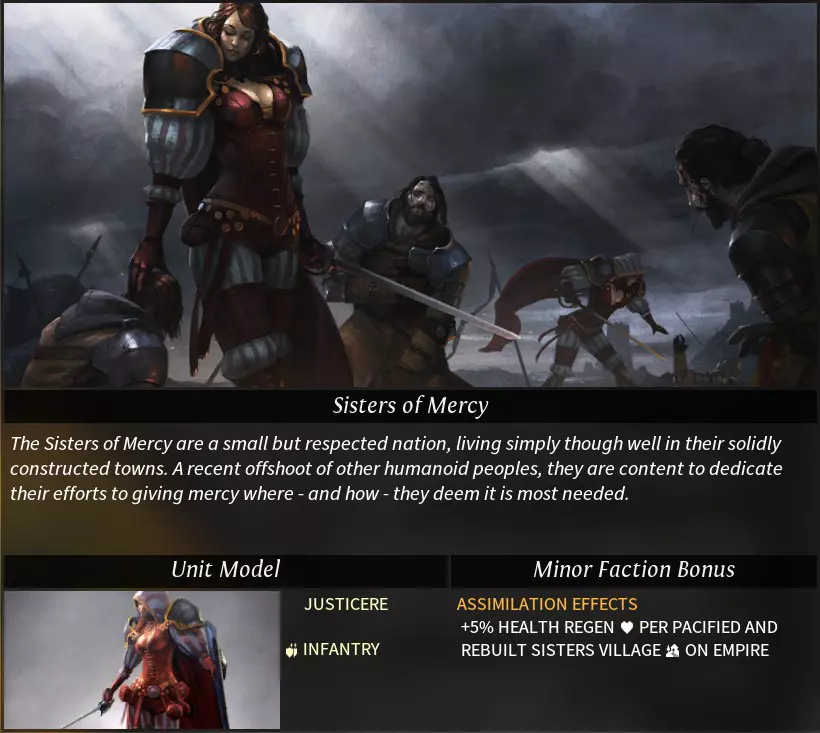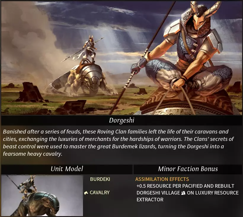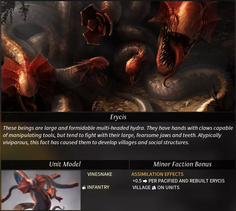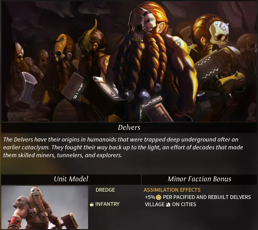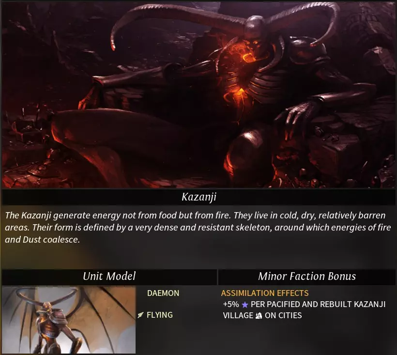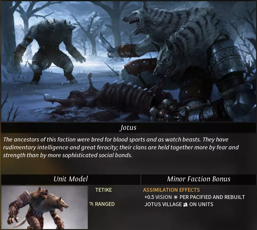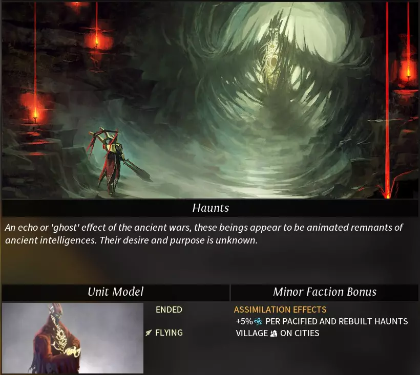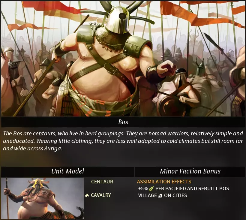 “Morgawr”一词源自康沃尔传说中的海怪。 阵营特性 种族特性: 亲水者(neptunian):登陆与登船不消耗移动力,运输船属性得到增强。 可选特性: 牵线木偶(catspaw):可使用“牵线木偶”控制中立军队,且能识别其他帝国的私掠军及被控制的军队。控制军队需消耗影响力,被控制军队将被视为私掠军,可解除控制(解除后不返还影响力)。 亲水性(hydrophilic):海洋/湖泊地形+2工业、+2科研产出;河流地形+1工业、+1科研产出。 海洋商人(sea trader):无法研究帝国道路科技,货运码头科技移至第二时代。 挑拨离间(seed of dissent):可将已驯服(消灭)的部落重新变为中立状态。消耗影响力,中立部落会同时刷新中立军队,且部落将不再提供任务。 **黑点(the black spot)**:可使用外交功能“黑点”。每次仅能对一个目标帝国使用,使用后任何帝国都可自由攻击该目标,消灭目标帝国的单位可获得星尘。 特殊科技:
