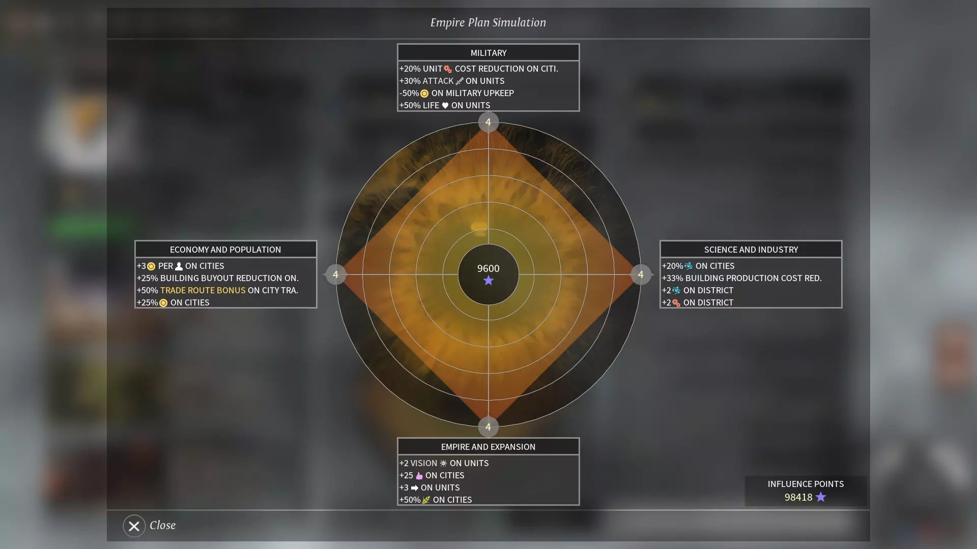 普通游戏速度下,**帝国计划**会在游戏开始后20回合时开启,持续20回合。 帝国中的城市越多,每次计划消耗的影响力就越多。在帝国计划无法变动的回合,可以通过帝国总览中的**帝国计划模拟**功能,推测大致需要囤积的影响力点数。 游戏初期仅能开启第一层帝国计划,随着时代发展将逐渐解锁其余三层。 相关成就