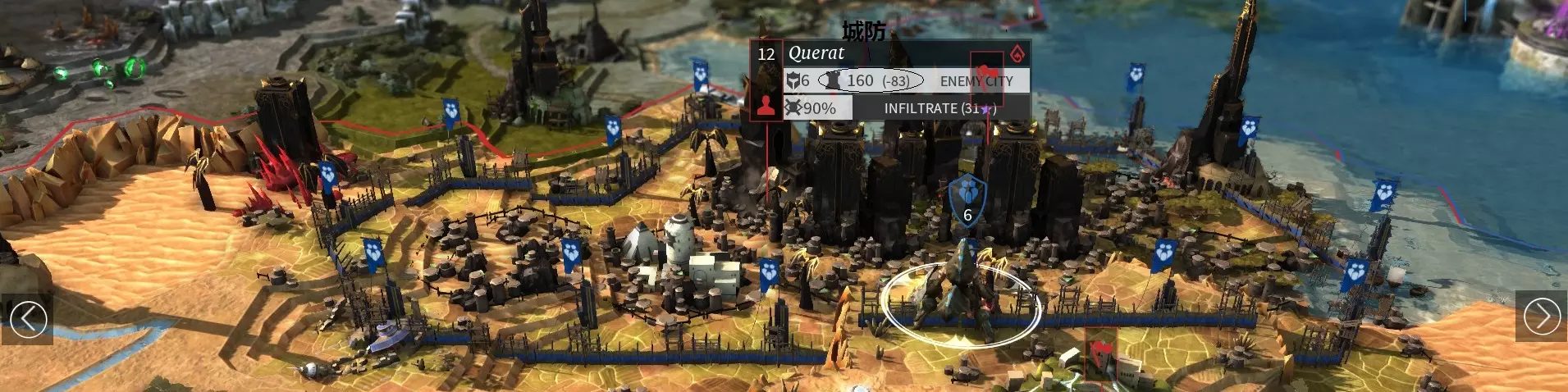 这是有效的降低城防的方式,被围城的城市每回合会损失相当于军队围城伤害的城防值。 城市处于围城状态时,城内单位无法移动至城外,城外部队也无法移动至城内,但双方可以相互支援。 城市处于围城状态时,城市开发区域将无法提供产出,无法建造扩张建筑,执政官也不能离开城市。 相关成就