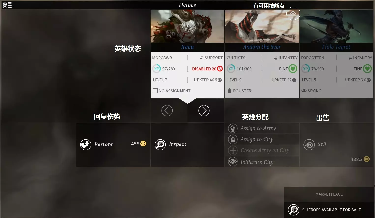 无尽等级(Endless Leveling) 将一位英雄等级提高至15级。 军队管理 军队界面用户界面(UI)介绍