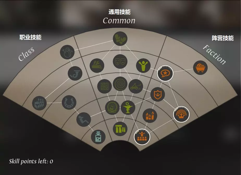 等级每升高一级,英雄就能获得一个技能点。 英雄与普通单位一样也分为步兵、射手、辅助和飞行4个职业(没有骑兵英雄)。 技能树左侧为职业技能,中间为通用技能,右侧为阵营技能。 相关成就