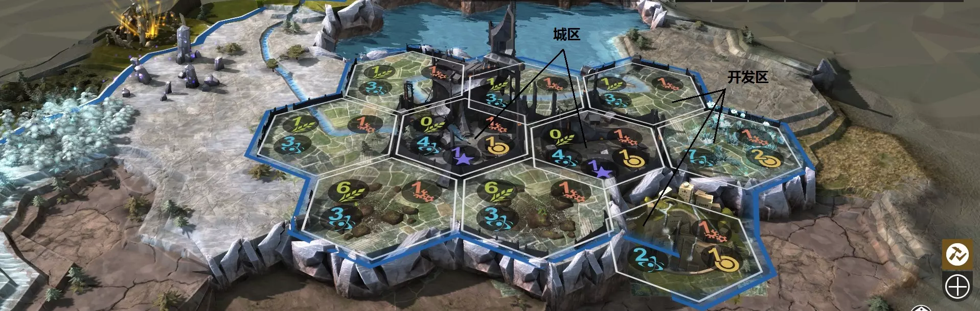你可以在城市中驻防单位,若驻扎位有空余,新生产的单位会自动进入驻扎位。除驻扎部队外,城市中还有默认的**民兵(militia)槽**,会自动生成反骑兵的民兵单位,民兵仅能在城市遭到攻击或友军在城市附近作战时加入战斗。 城区与开发区域 城市的产出地块有两种类型:**城区(district)** 和**开发区(exploitation)**。