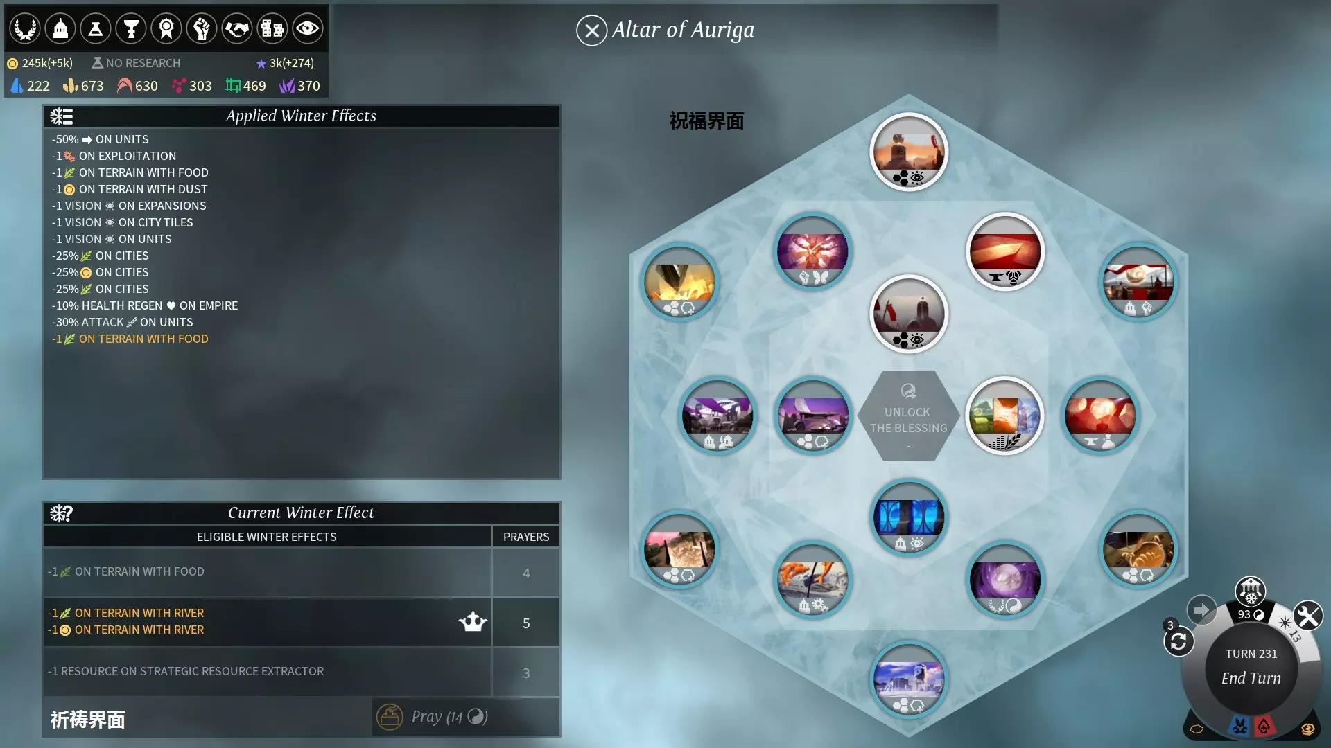 祝福 祝福科技需要花费明珠解锁。 祝福科技树共三层,每层需要游戏度过一个冬天解锁。 祈祷 每次冬天结束后,会刷新出3到4个下一冬季效果以供祈祷。 祈祷数目最多的(王冠)效果将在下一冬季生效。 祈祷花费的明珠数量会随夏天过去的天数增加。 防御塔 奥里加圣坛中的祝福可以解锁与哨塔不同的防御塔——真实之塔(tower of truth)。
