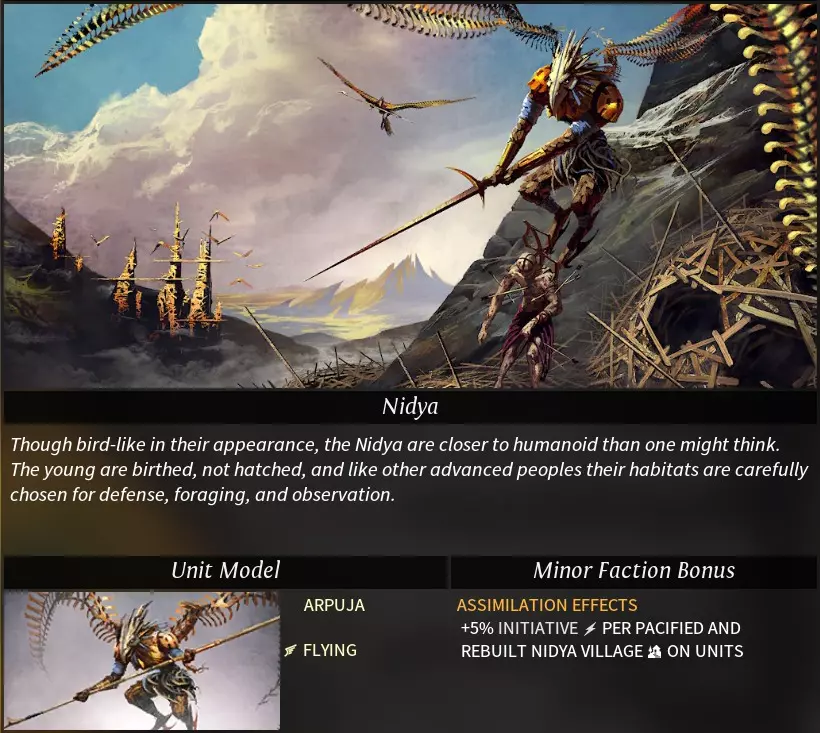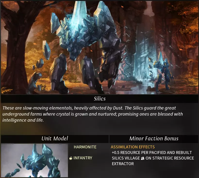 阵营特性 种族特性: 形态变幻(shifting):允许单位切换至光(夏季)和暗(冬季)形态。 可选特性: 战场抱团(battlefield symbiosis):每点士气提升15%主动性。 奥里加之息(breath of auriga):季节预测误差减少100%。 明珠感应(pearl sensitive):在已探索地块显示明珠位置,探索遗迹可获得明珠。 人口稀少:扩张不满度增加150%,城市占领度回复速度增加100%,人口增长粮食需求增加100%。 独特科技: