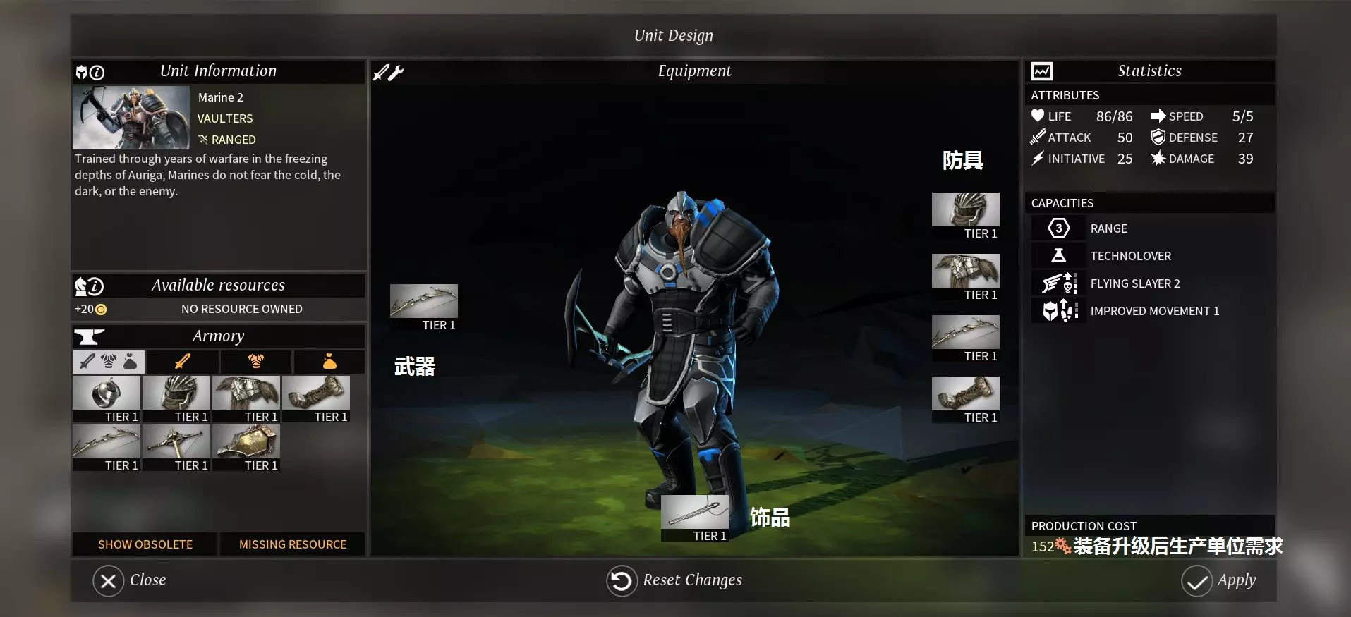 兵种可升级装备分为三种:武器、防具和饰品,每种都有3级。新的可用装备来源于科技研究、时代进步和探索任务。 其中铁、星尘装备随时代解锁;钛、玻璃钢装备需要科技研究;精金、帕金的1、2等级装备需要科技研究,3等级装备需要任务解锁;秘银、亥1等级装备需要科技研究,2、3等级装备需要任务解锁。 对城市或军队进行加成的饰品,以及通过任务探索获得的一些强力装备仅能由英雄使用。 ### 武器特性 不同的兵种模型可以装备不同的武器,不同的武器种类会给单位附加不同的特性: - **剑-单手-双手(sword)**:步兵杀手(infantry slayer),对步兵单位伤害增加。斧头-单手-双手(axe):射手杀手(ranger slayer),对射手单位伤害增加。 锤子-单手-双手(hammer):重击(stun),几率使目标无法行动两回合。 弩-单手(crossbow):近程打击(point-blank power),近身攻击伤害增加。 弓-双手(bow):飞行杀手(flying slayer),对飞行单位伤害增加。 长枪-双手(spear):骑兵杀手(cavalry slayer),对骑兵单位伤害增加。 爪-双手(claw):横扫反击(sweep strike back),反击时增加伤害,且对反击目标附近的敌方单位造成伤害。 法杖-双手(staff):减速(slow down),降低目标50%战场移动力2回合。 权杖-双手(scepter):衰老(exhaustion),降低目标防御力2回合。魔杖-双手(wand):震颤(unsteady),降低目标攻击力2回合。 盾-副手(shield,使用单手武器时装备):格挡(block)、敏锐(sharp sense),受到近身/远程攻击时增加防御力。 战斗系统 战前界面
