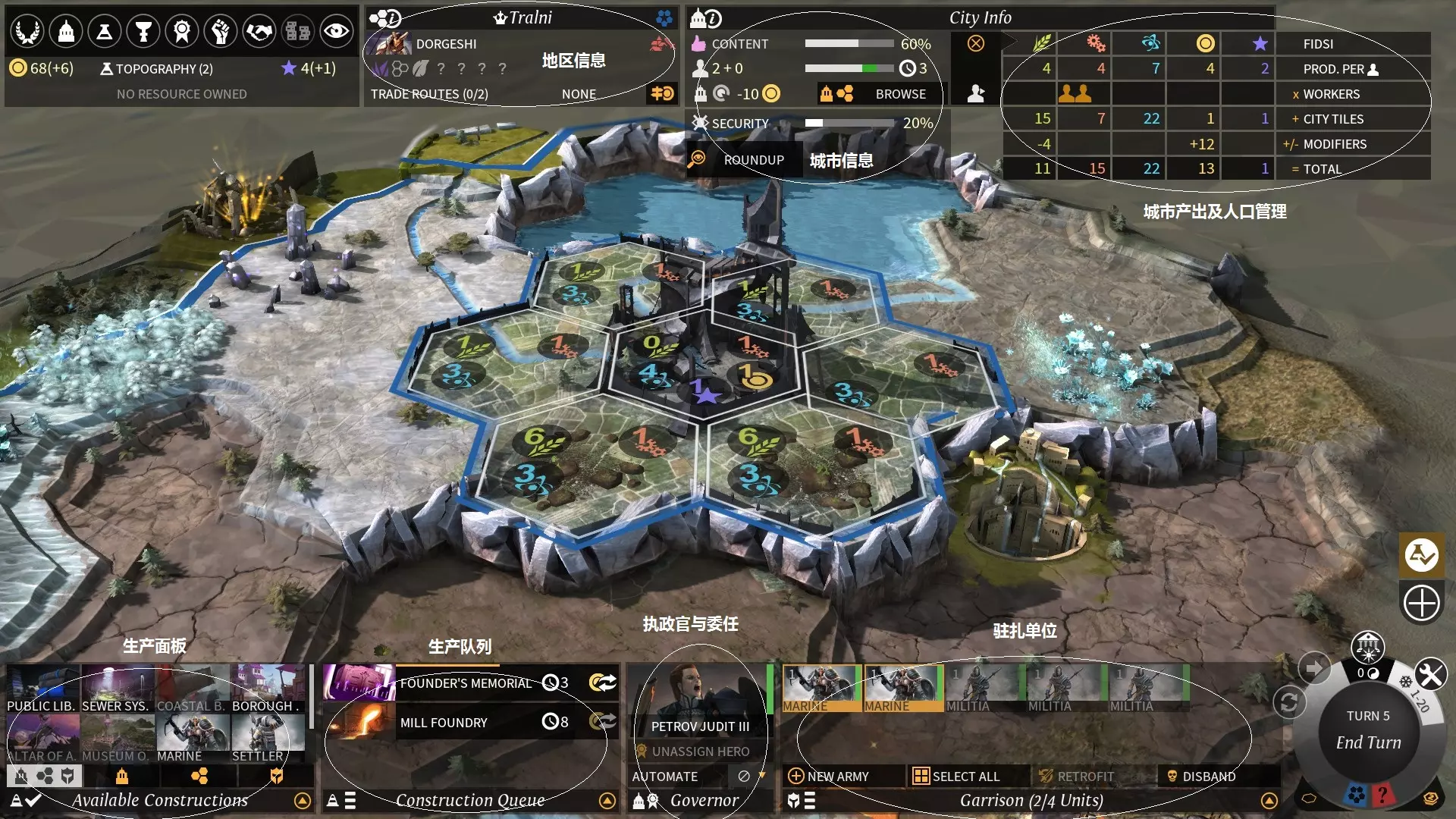 ,占据该区域。 殖民者可在城市中生产,需要消耗1人口,且生产期间城市人口无法增长(老文明系列设定)。 城市管理 城市界面