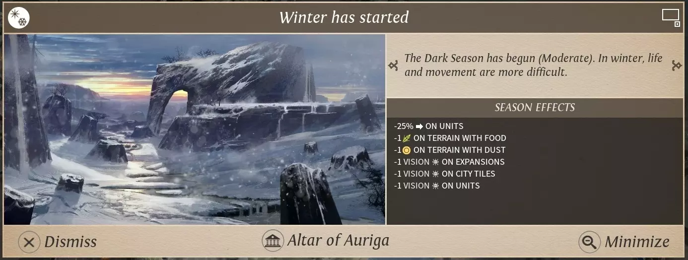 谁,我么? 使用私掠军进攻一支联盟方的军队。 季节变化 游戏中分为夏(summer)、冬(winter)两季,一些建筑只能在特定的季节工作。在冬季,视野、移动力及城市产出都会受到影响(影响强弱随游戏设定改变)。并且随着游戏回合数的增加,冬季会越来越长,夏季会越来越短(最短为一回合)。