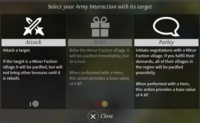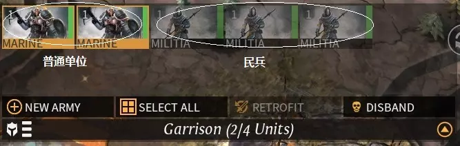将军:在军队中配置英雄作为将军,将军可参与战斗,并为军队单位提供加成。 可用行动:军队能够执行的行动。 行动点(action point):默认值为1点,每回合自动恢复。行动点用于进攻、增援其他进攻军队以及围城。 围城伤害:处于围城状态时,每回合对城市城防造成的伤害。 生命值:军队的总生命值,损失的生命值每回合会自动回复。 移动力:军队每回合可移动的距离,由军队中移动力最低的单位决定。 视野:军队的视野范围,由军队中视野最高的单位决定。 单位栏:展示军队中的所有单位,单位可自由拖出当前军队以组成新军队。单位晋升:根据兵种设计消耗星尘和资源升级单位装备,仅可在己方区域进行。 单位出售:将淘汰的单位售出换取星尘,可在任何地方进行(需研究佣兵市场,否则无星尘收入)。 军队规模:一支军队当前/最大单位数。军队规模同时影响城市中可驻扎单位的数量,可通过科技提升。每支军队都需花费与最大军队规模相同的额外维护费。 军队移动:军队通过不同地形会消耗不同的移动力,纯由飞行单位组成的军队则不受地形影响。军队(包括飞行单位)进入水面需研究船坞(ship yard,第二时代)科技,此时会损失当前所有移动力,所有单位将转化为运输船(transport ship)并失去所有属性。若通过货运码头进入水面则可保留移动力。