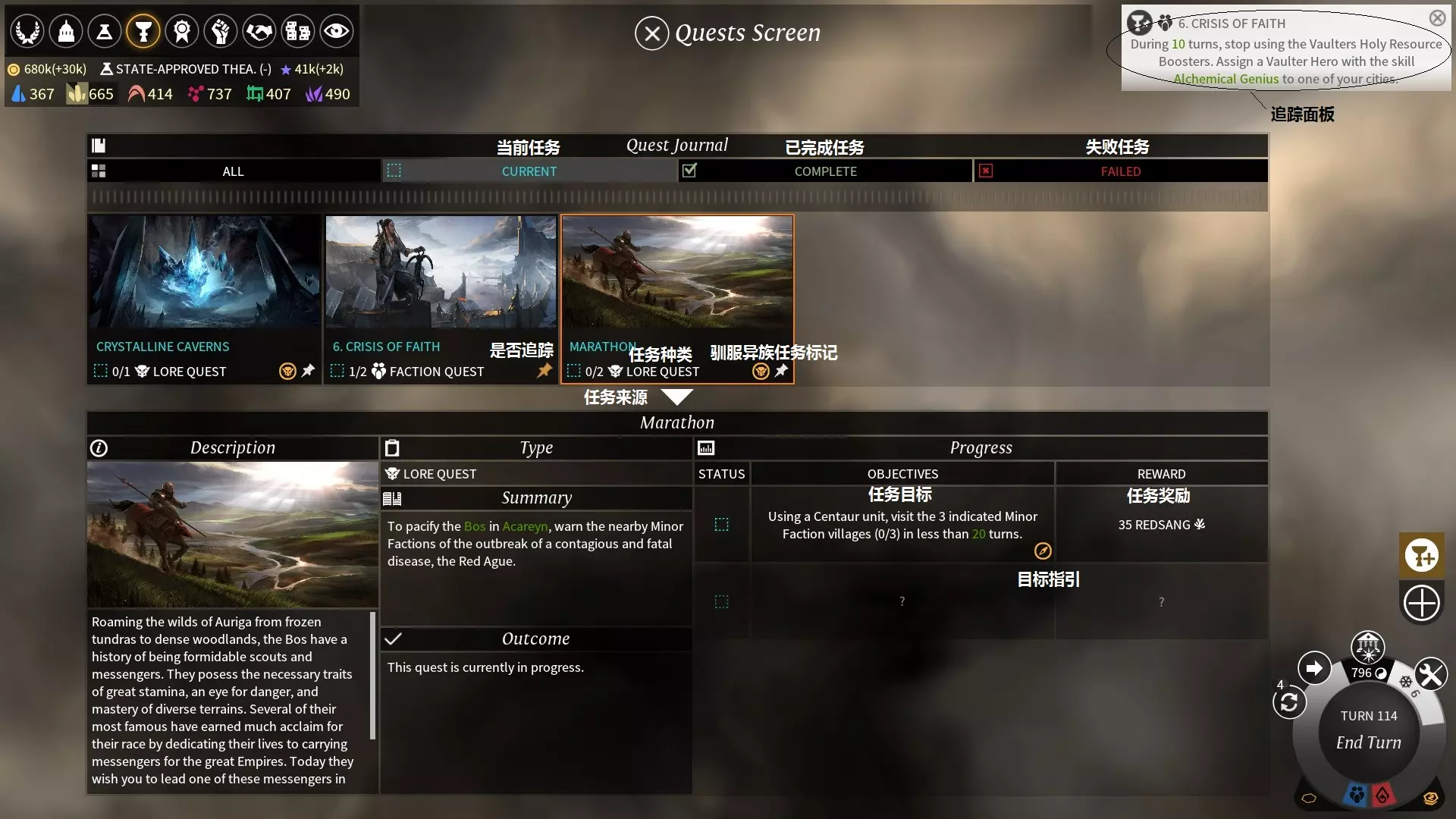 UI介绍(屏幕上方) - **帝国总览**:查看帝国的整体情况。 - **城市总览**:查看所拥有城市的整体情况。 - **科技界面**:查看整体科研产出及科技树。 - **任务界面**:查看接受任务的情况。 - **英雄学院**:查看、整理、调动帝国的所有英雄。 - **军事界面**:查看、管理军队情况,设计和改良兵种。 - **外交界面**:查看其他帝国的关系及进行外交互动。 - **市场界面**:招募英雄、雇佣兵,购买、出售各种资源。 - **间谍界面**:DLC2。 UI介绍(屏幕下方) - **军队界面**:管理当前军队。 - **消息栏**:本回合的所有事件报告。 - **奥里加圣坛**:DLC3。 - **季节预测**:距离下一季节的大概回合数。地图介绍 **区域**(淡黑色边框内):游戏地图被划分为各个区域,一片区域内仅能建立一座城市。 **异象**:相比普通地块提供额外的产出。 **遗迹**:可探索地点,每个区域一般存在1至2个,探索该地点有机会获取星尘(dust)、资源及任务。 **异族阵营/部落**:可驯服(pacify)的部落,非驯服状态会刷新敌对的野怪军队在区域内游荡。 **战略资源**:战略资源采集点,需要先研发对应科技并建造相应的开采建筑。 **奢侈资源**:奢侈资源采集点,需要先研发对应科技并建造相应的开采建筑。 UI介绍:帝国总览