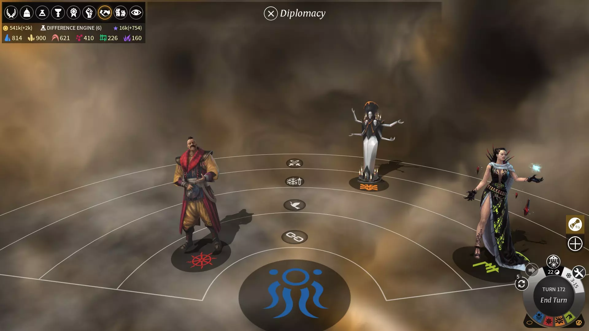 在外交面板上,从近到远的帝国关系分别为:**联盟(alliance)**、**和平(peace)**、**冷战(cold war)**、**战争(war)** 及处于外圈未发现或已被击败的帝国。 - **战争**:双方可以自由攻击,战争状态下仅能签订休战条约(truce)。 - **冷战**:双方可以在中立区域和己方所在区域自由攻击。 - **和平**:双方不能互相攻击,商路自动生效,并可签订新条约(treaty)。签订和平条约需研究相应科技,且签订后一定回合内打破条约需消耗额外影响力。联盟:除和平所带来的效果外,双方共享视野并可共同探索地图。击杀联盟敌对帝国(处于战争或冷战状态)的单位可获得影响力,联盟双方还会根据联盟持续回合数获得额外的影响力产出。签订联盟条约后,任何边境关闭条约将自动失效且无法再签订。签订联盟条约需研究相应科技,且在签订后的一定回合内打破条约需消耗额外影响力。 签订和平条约需研究“大使馆”(diplomat`t manse,第二时代)。 签订联盟条约需研究“待客居”(hospitality den,第四时代),且无需以和平关系为前提。