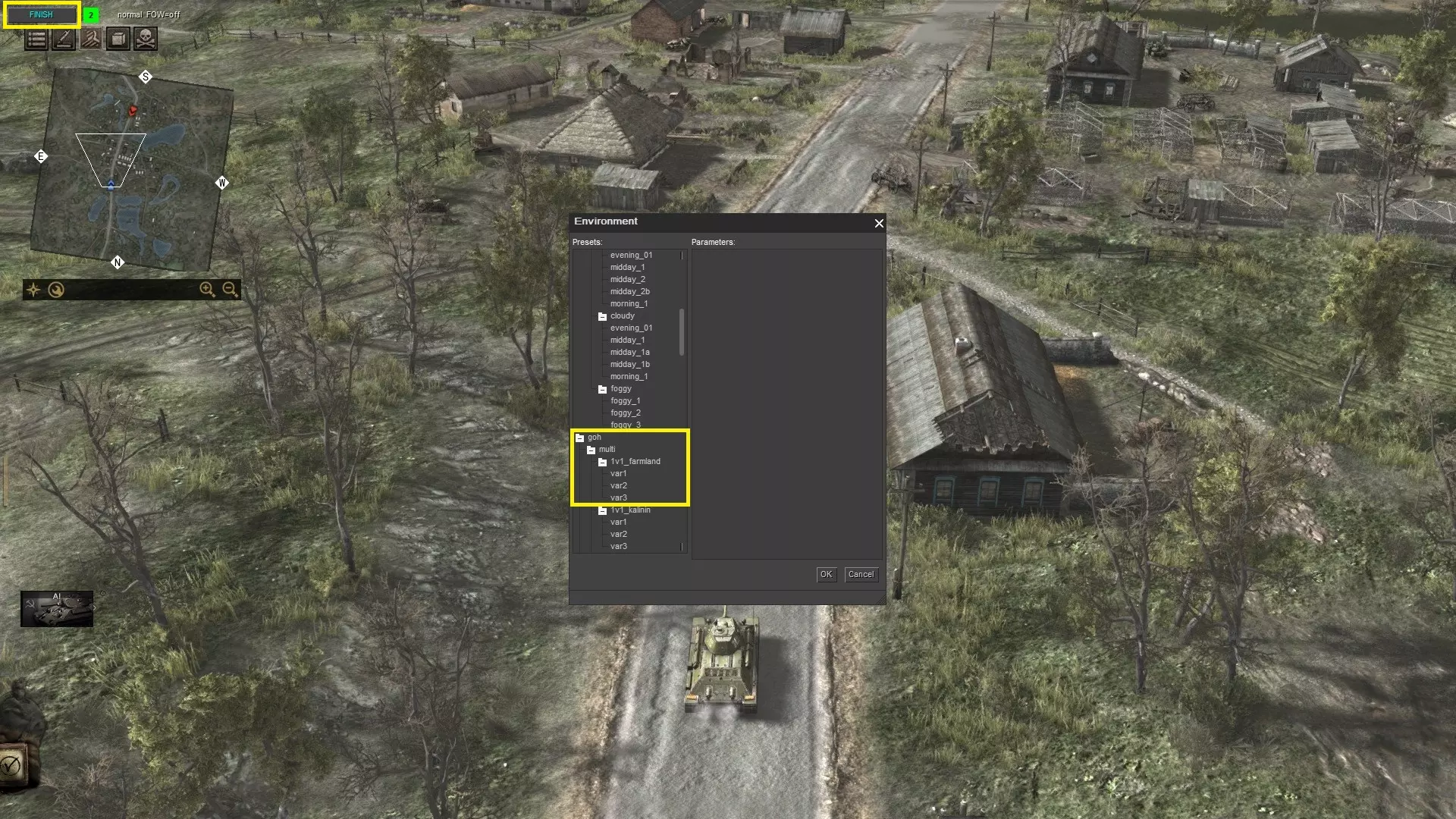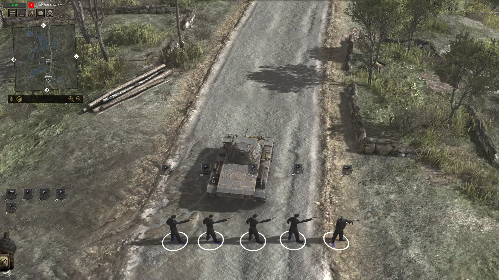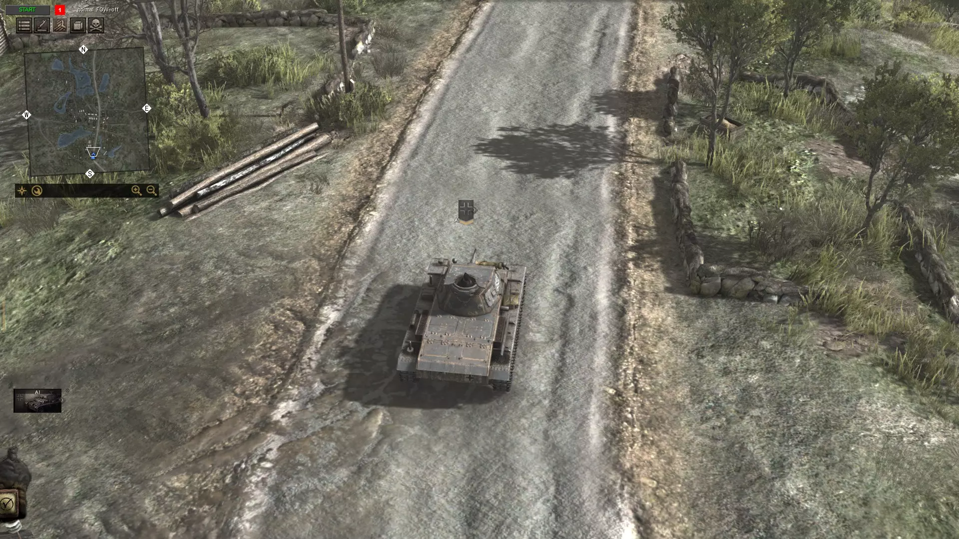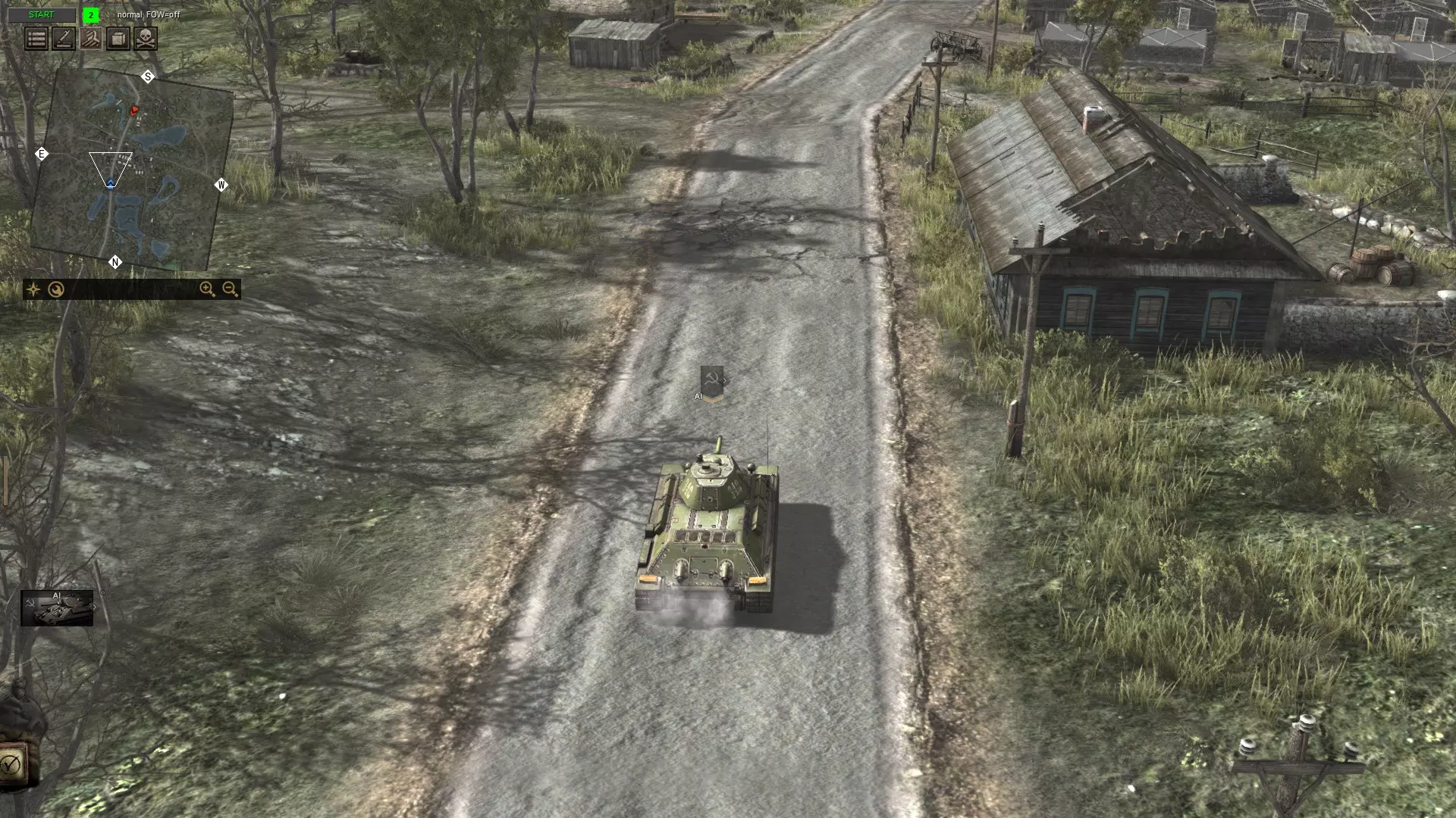 行动 战斗时间到。按下左上角的“开始”键。按F6键选择你想要的任意环境。记住,如果你将T-34(T-34坦克)生成在离三号坦克(Panzer III)太近的位置,它们会在你按下“开始”键后立即开始互相攻击。