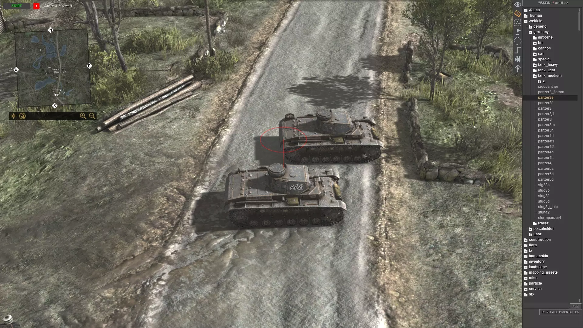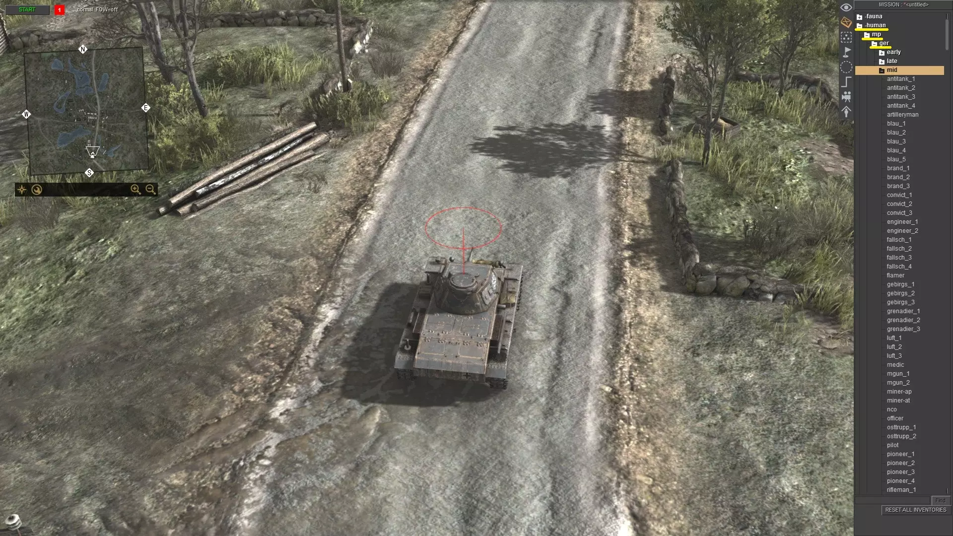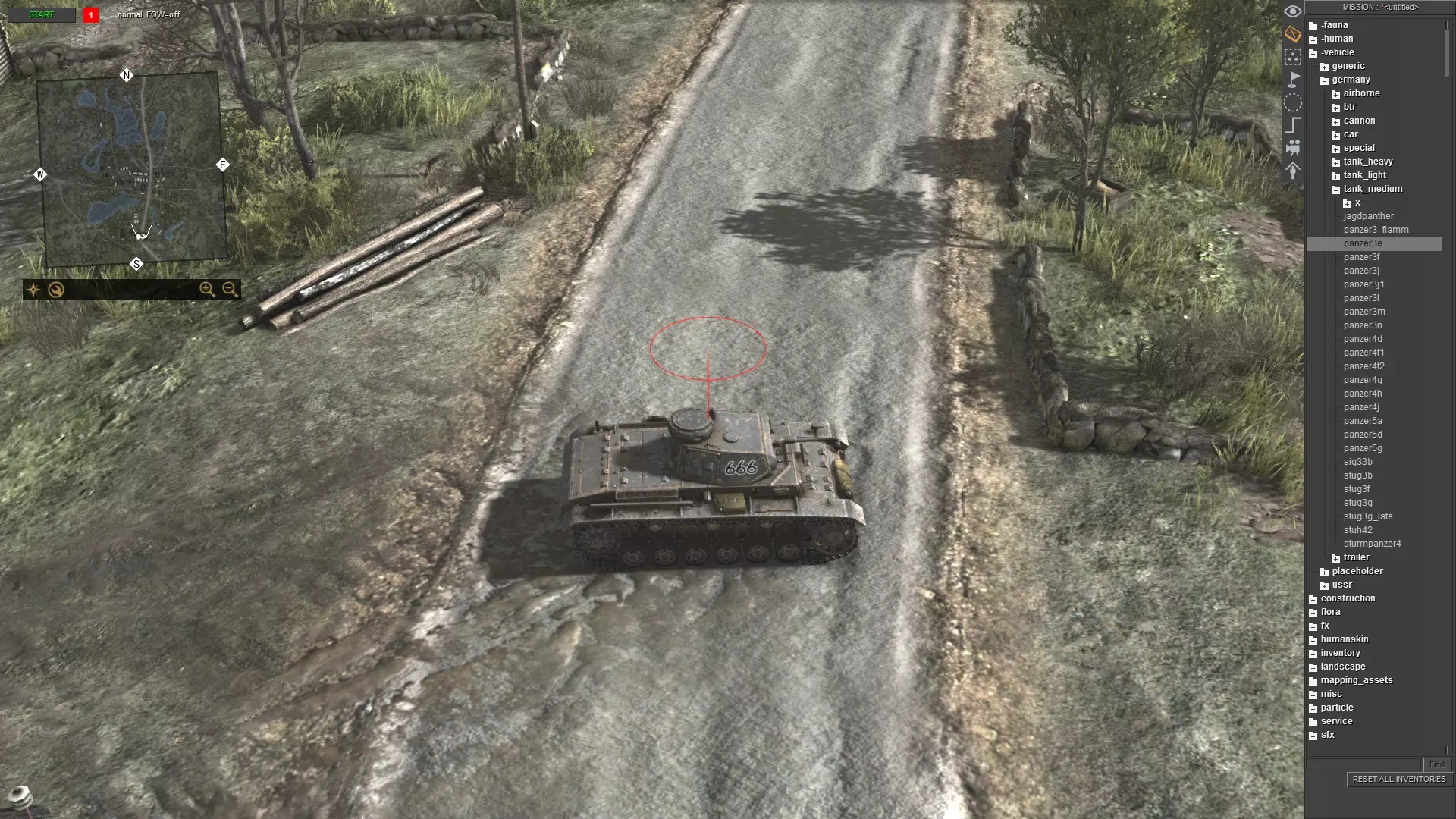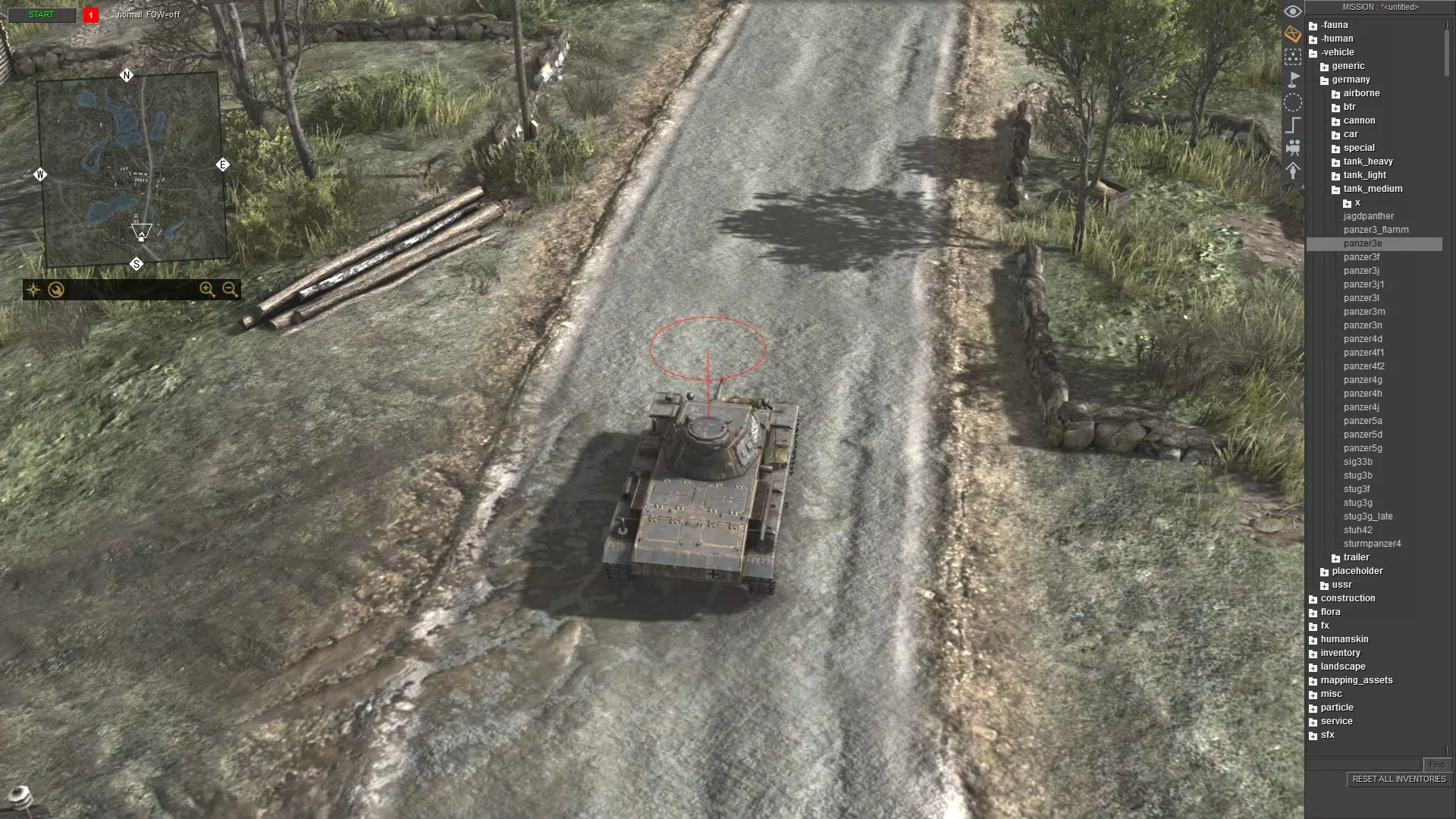 刚开始可能看起来有点复杂,但只要多重复几次,你就会变得熟练。只需记住以下步骤: 按ESC键打开菜单 点击“加载”并选择任意地图 按F3键 按CTRL+S键 输入任意内容,例如“empty”,然后按回车键或点击确定 再次打开菜单并点击“重新加载” 对于没有太多对象和脚本关联的地图(如多人地图),你仍然可以使用方法1。例如battle_zones.mi。 单位生成 要生成单位,请使用任务编辑器(F3)。现在,生成你想要的任何单位。我选择了三号坦克E型。