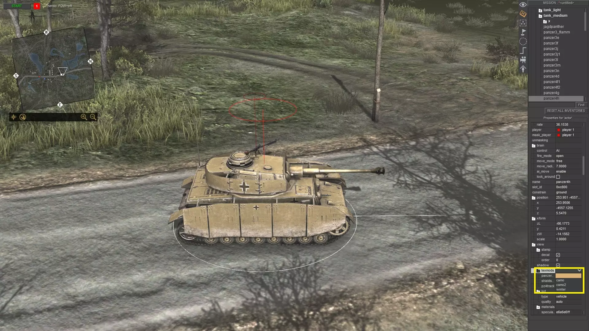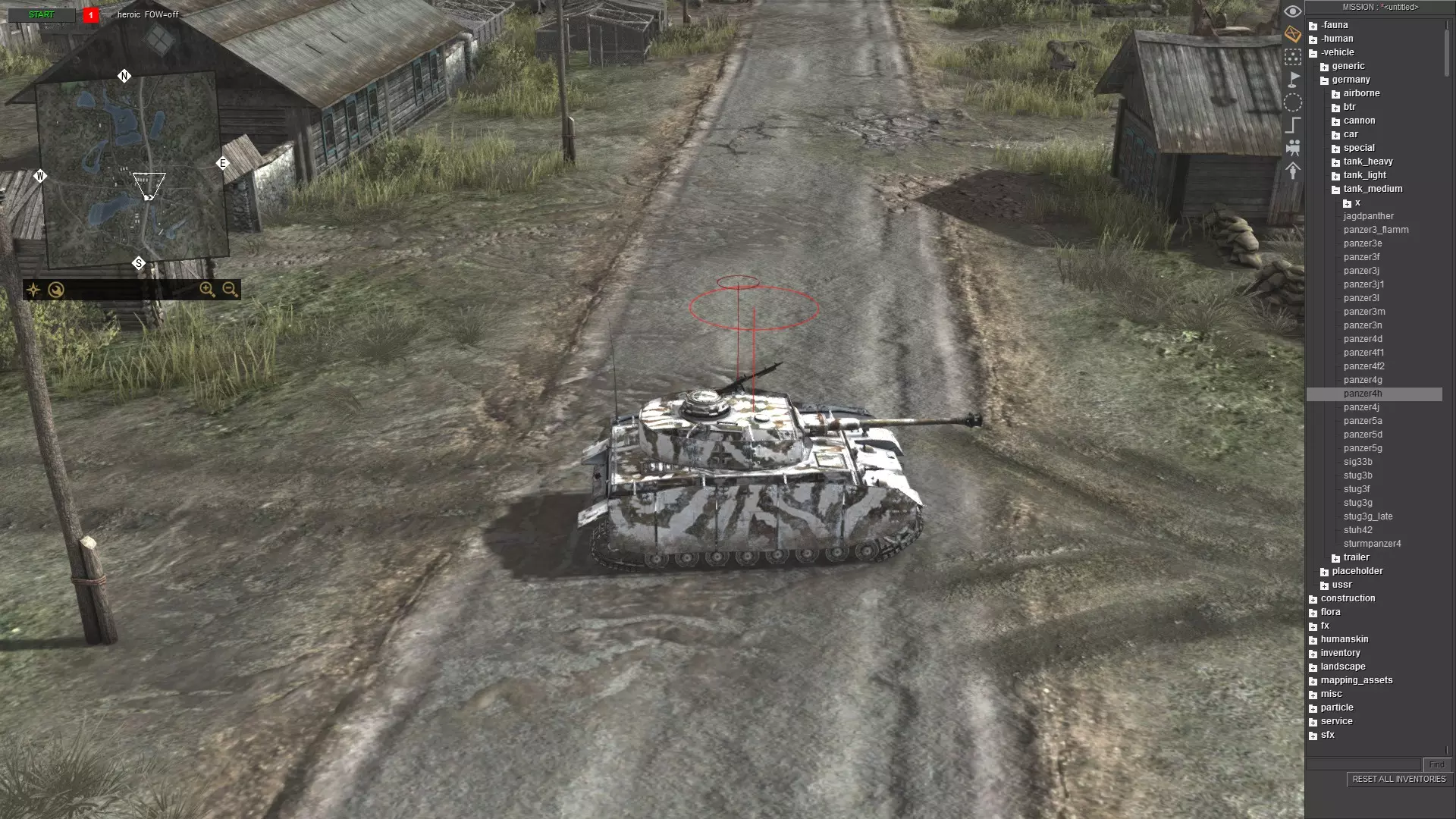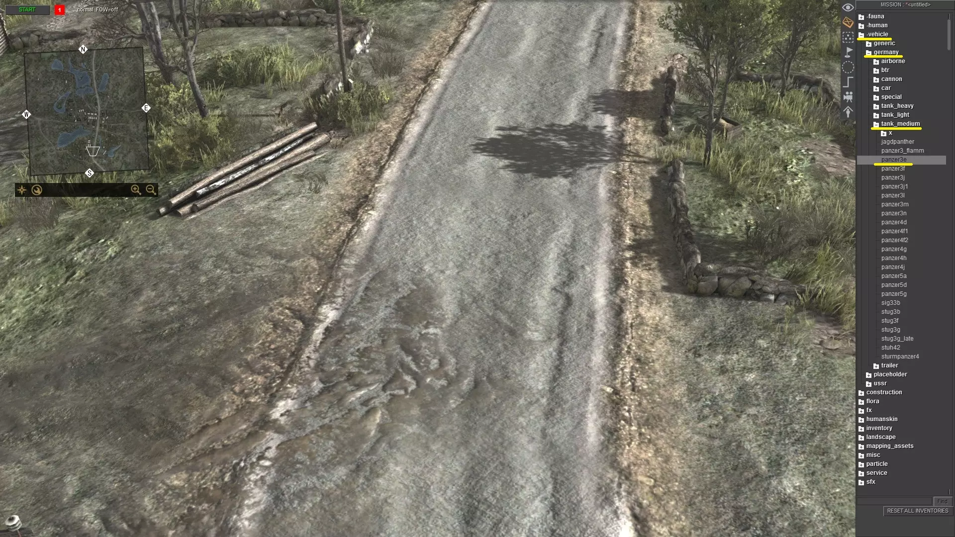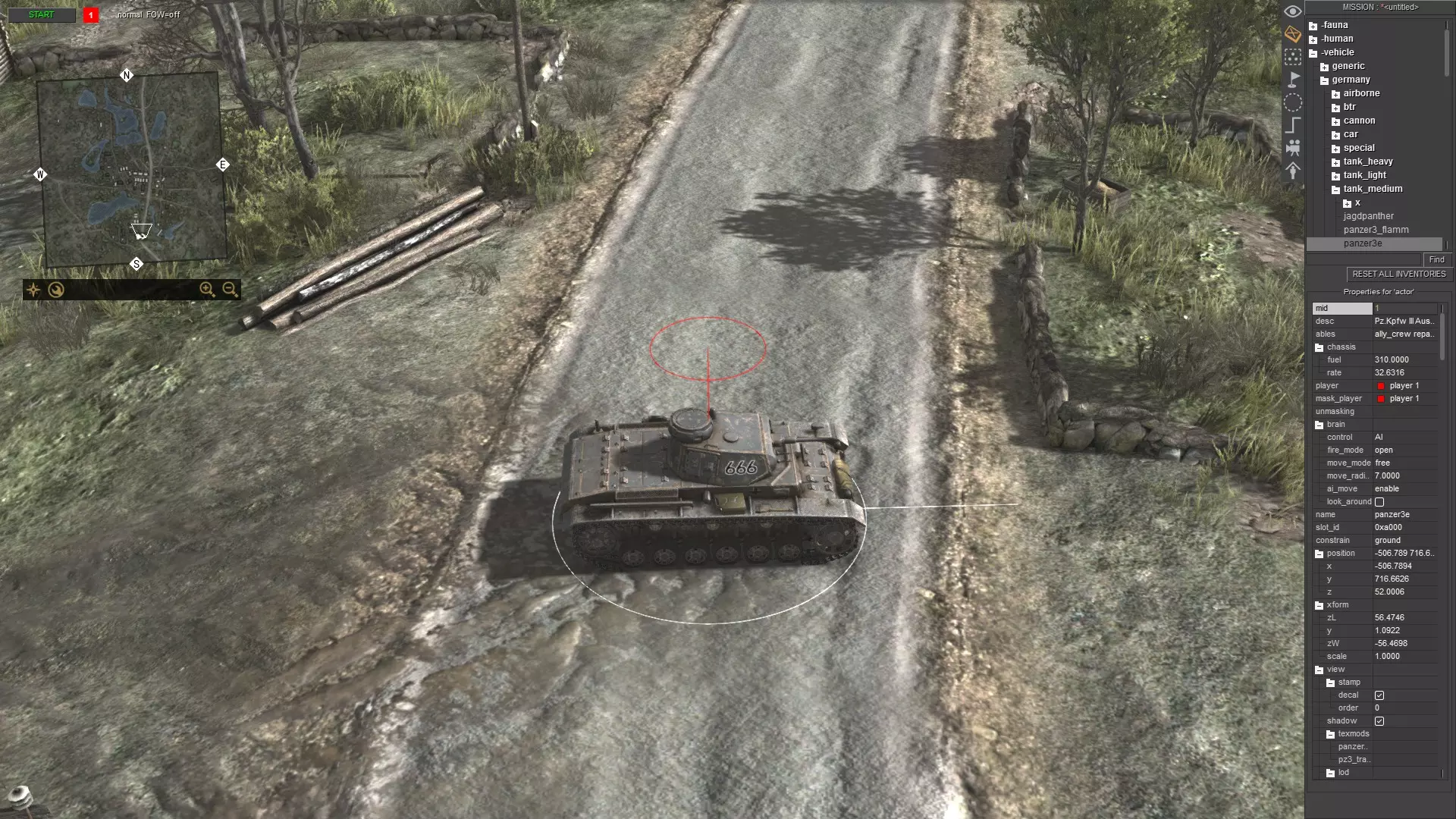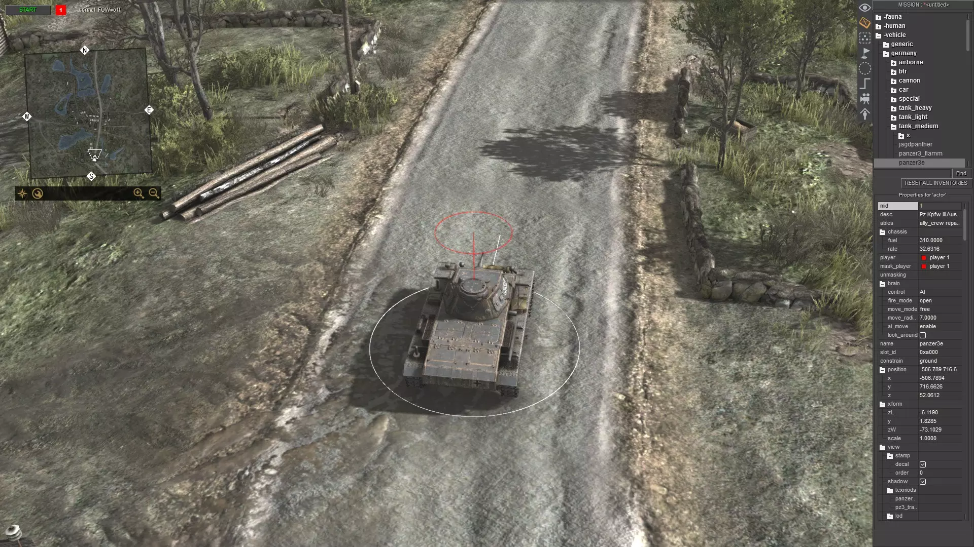 刚开始可能看起来有点复杂,但只要多重复几次,你就会变得熟练。只需记住以下步骤: 按ESC键打开菜单 点击“加载”并选择任意地图 按F3键 按CTRL+S键 输入任意内容,例如“empty”,然后按回车键或点击确定 再次打开菜单并点击“重新加载” 对于没有太多对象和脚本关联的地图(如多人地图),你仍然可以使用方法1。例如battle_zones.mi。 单位生成 要生成单位,请使用任务编辑器(F3)。现在,生成你想要的任何单位。我选择了三号坦克E型。