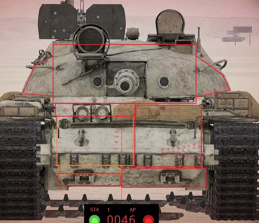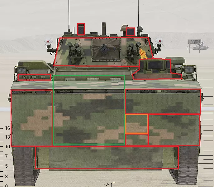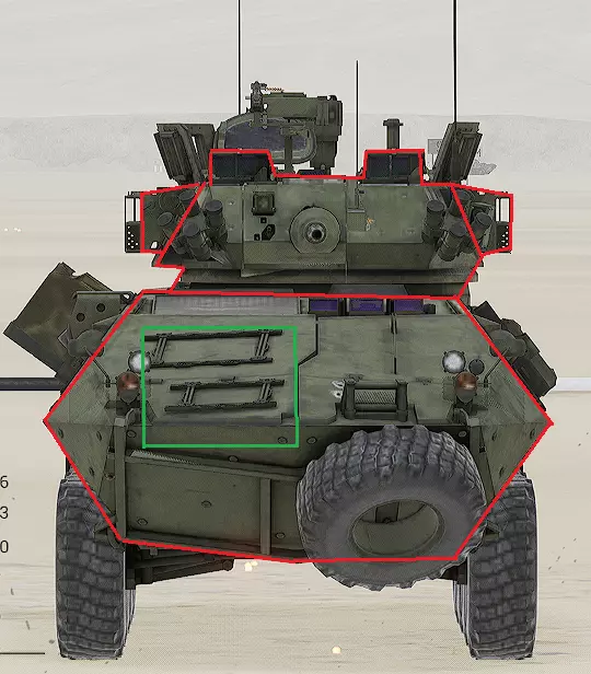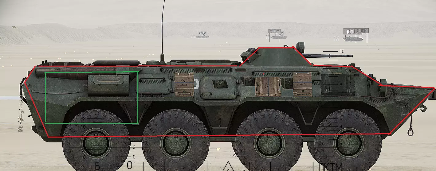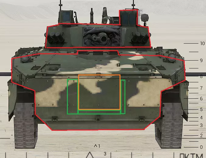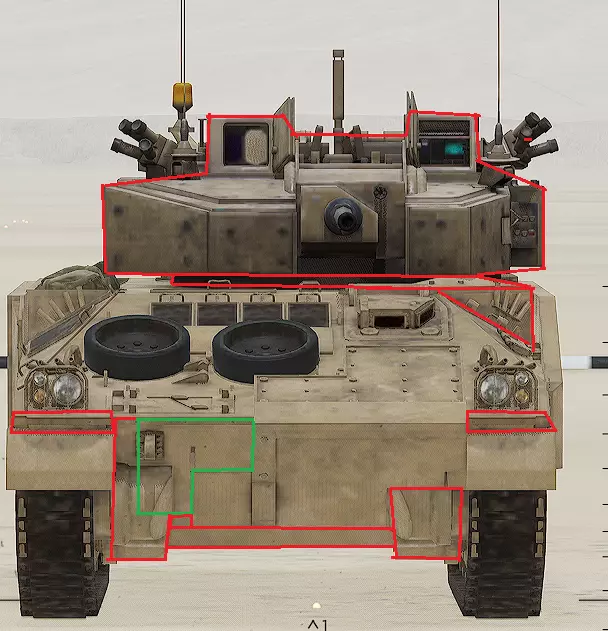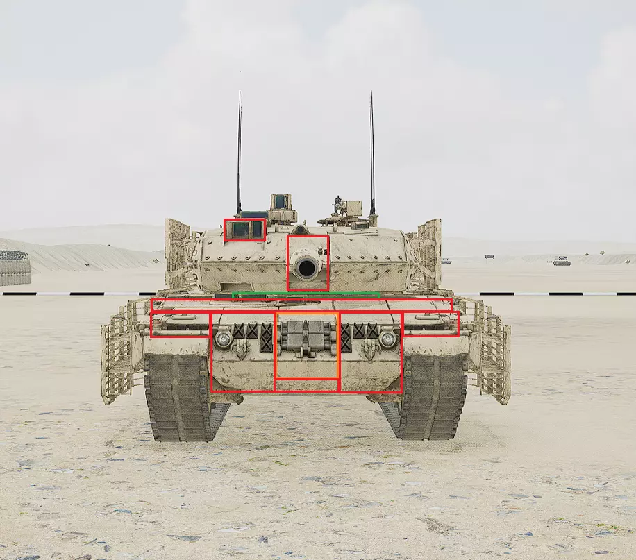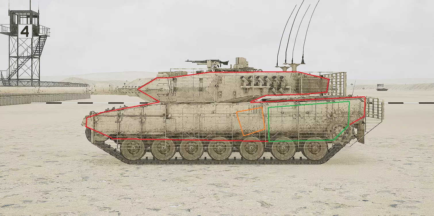 红色轮廓 - 穿透区域 绿色轮廓 - 发动机 橙色轮廓 - 弹药架(当距离<700米时,命中2次) 可在3D模式下查看任意载具装甲厚度以及炮弹命中位置和造成伤害情况的网站:https://squad-armor.com/ 创意工坊中可用于练习技能的模组:https://steamcommunity.com/sharedfiles/filedetails/?id=2848273764 俄语: 红色 - 穿透区域 绿色 - 发动机 橙色 - 弹药架(当距离<700米时,命中2次) 可在3D模式下查看任意载具装甲厚度以及哪些炮弹可将其穿透的网站:https://squad-armor.训练用模组:https://steamcommunity.com/sharedfiles/filedetails/?id=2848273764 冲击效果/命中效果