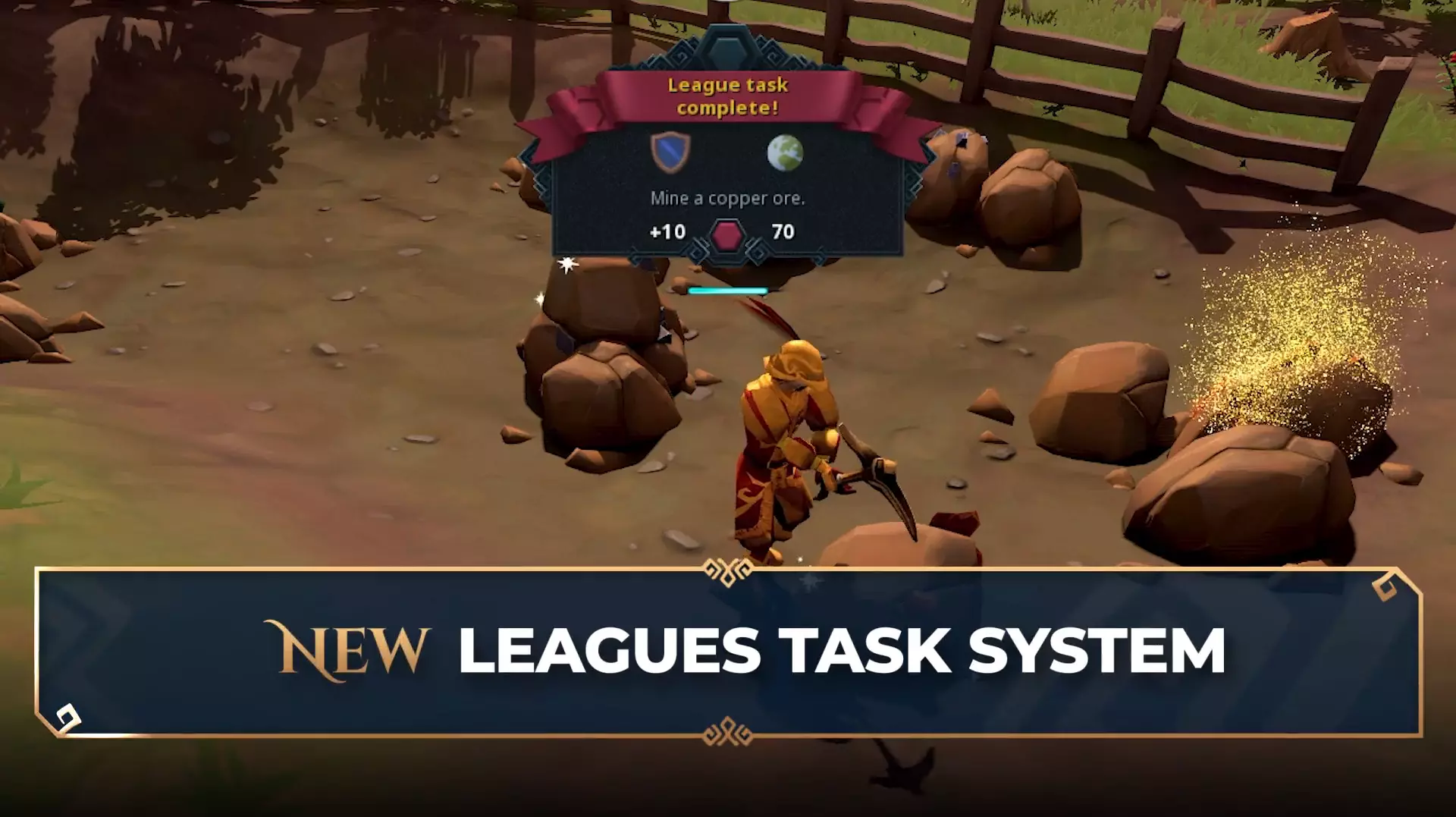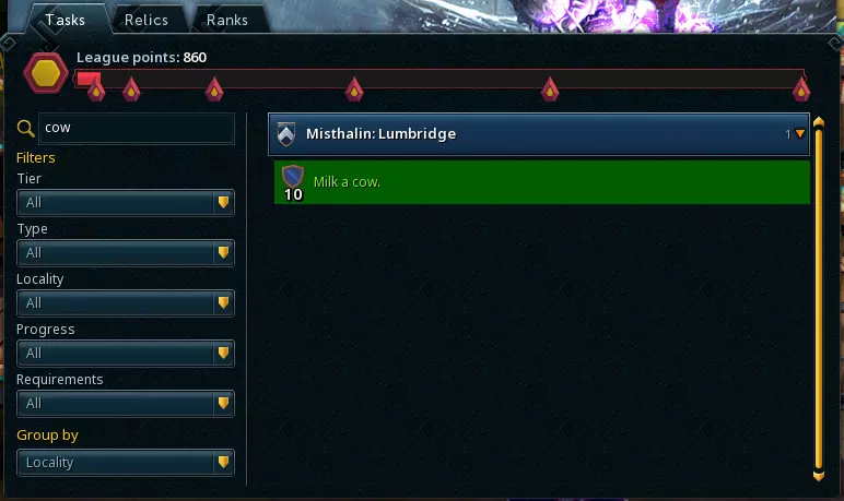 任务是你在联赛赛季中走向成功的关键。任务是一系列挑战和成就的集合,它们会推动你探索吉琳诺的每一个角落。这是一个经典的正向反馈循环——你完成的任务越多,获得的联赛点数就越多,解锁的遗物等级也就越强大,进而能获得更多点数来解锁更强大的遗物! 任务分为从简单到大师的不同等级,每个等级的任务都会以不同方式考验你的技能。简单任务是快速的胜利,例如在卢姆布里奇击败一名哥布林,每个可获得10点积分。而位于另一端的大师任务则是艰巨的挑战,需要专注、毅力和技巧,完成这些传奇壮举将获得丰厚的400点积分。这些任务涵盖了吉琳诺冒险的方方面面:技能训练、稀有掉落物收集、击败可怕生物、完成史诗任务以及投身迷你游戏。无论你喜欢何种玩法,总有挑战等着你去突破自我。 每一层级都藏着遍布世界各地的试炼宝藏。从速通胜利到艰难成就,你完成的每一项任务都能为你赢得积分,助你攀登更高层级,离终极荣耀也更近一步。