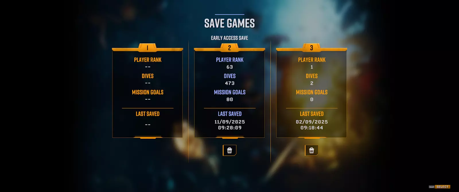 装备分为四种稀有度,从 uncommon(不常见)到 Legendary(传说),稀有度越高,提供的属性值越多,有时还会附带多种特性。随着玩家等级的提升,获取高稀有度装备的概率也会提高,而装备等级则会随着进程里程碑的推进而提升(例如,完成首次危险等级 2 的深潜任务后,所有掉落装备的最低等级都会提高)。此外,装备可以使用 credits( credits)和 minerals( minerals)进行最多三次升级。装备初期可能看似较弱,但属性值会显著增长,与元升级叠加,并随配装选择而倍增。这一系统确保了长期的角色成长、有意义的决策制定,以及 Bosco( Bosco)更重要的作用。 关于装备的完整 Steam 帖子可在此处查看。 存档槽位与难度平衡调整 1.0版本新增了存档槽功能,这样你可以保留抢先体验阶段的进度,同时如果你想从头开始体验新系统,也能开启全新的游戏进程。