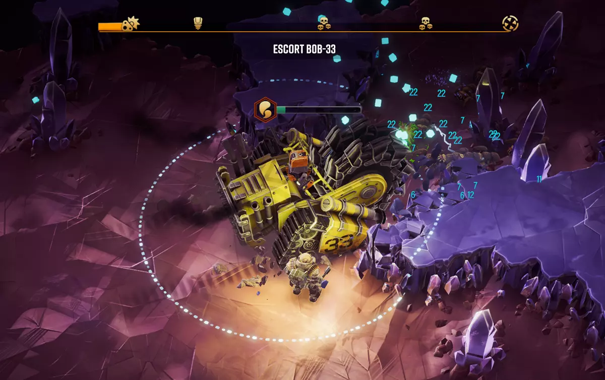 我们在游戏中新增了名为“护送任务”的全新任务。在此任务中,你将负责护送名为“钻掘机B0b-33”的机器——这是一台旨在粉碎岩石、虫群和矿物,直至抵达令人梦寐以求的欧莫兰之心石的设备。与“消灭任务”不同,你的主要目标不仅仅是生存,而是保护钻掘机B0b-33并确保其正常运行,直至它到达目的地。钻掘机B0b-33需要持续使用油页岩进行燃料补给,一旦燃料耗尽,它便会停止运转,直至你开采到更多燃料。 任务开始时,你需要清理出一条通往投放区的路径,并在此区域布设炸药,为钻掘机炸开一条向下的通道。一旦钻掘机B0b-33安全送达,玩家将深入洞穴更深处,最终进入最后阶段:钻取欧莫兰之心石。心石的外壳过于坚硬,镐子无法破坏,因此钻探机至关重要。不过,钻探机也会触发防御机制,例如发射激光的光束塔,必须先用镐子破坏这些光束塔才能继续推进。 护卫任务需要新的策略。玩家不应专注于击杀首领的配装,而必须在抵御虫群的同时保护一个移动目标。B0b-33本身既可以作为掩护,也能当作武器来横扫敌人。节奏把控至关重要:只有玩家待在附近时钻探机才会移动,这让玩家能够控制节奏,但等待时间越长,虫群的难度就会越高。 关于新任务的完整Steam公告可在此处查看。 任务路线图 随着新任务的加入,我们围绕任务路线图重建了进度系统。每种任务类型(歼灭任务和护送任务)现在都有独立的五个区域进度,关卡门标志着你冒险旅程中的关键里程碑。要前进,你需要完成足够的任务目标来解锁区域关卡门——这是下一个危险等级的特殊深潜任务。击败关卡门后,即可开启下一个区域。