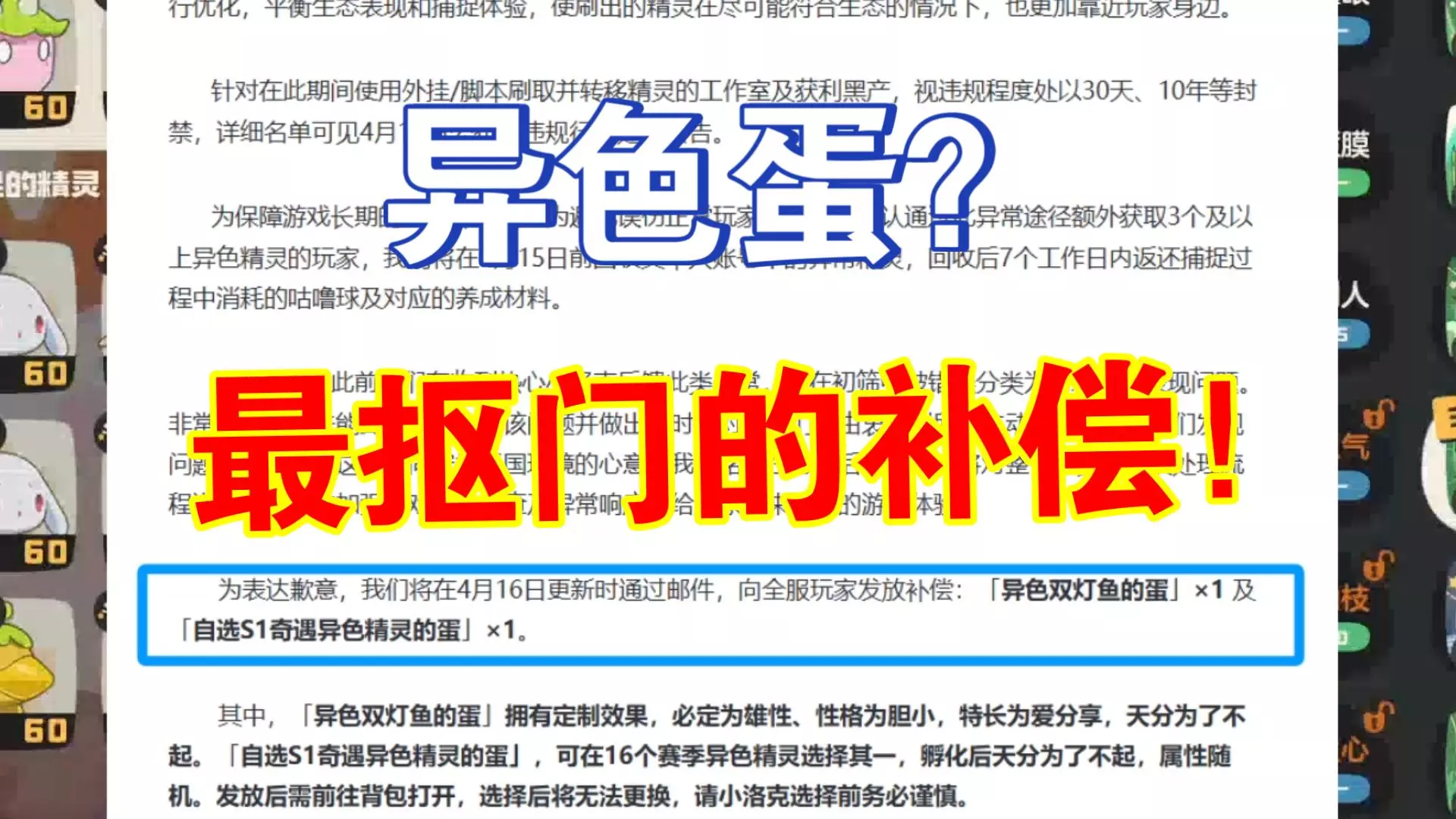 洛克王国世界将在4月16日更新后发放全服补偿,同时推出多项游戏调整优化。补偿包含定制异色双灯鱼的蛋与可自选16种S1异色精灵的蛋;更新还降低了咕噜球合成与购买成本,优化玩家游戏体验。