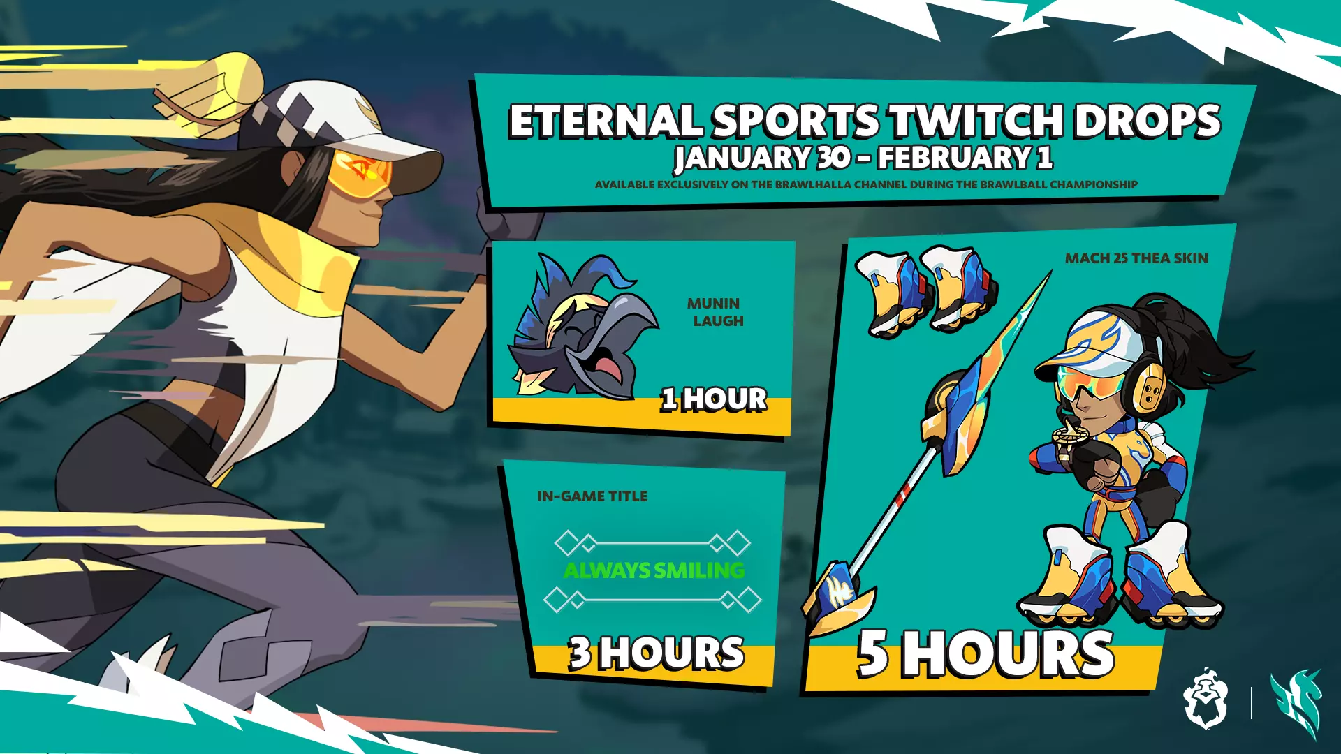 免费英雄轮换已受到黑心腐化的影响。宿敌“裂破”首次加入免费英雄轮换,将其近乎无可匹敌的力量赋予所有渴望驾驭它的人。火箭 lance、短刃,以及被误解的黑心之力,将令所有面对它们的人感到恐惧。 首届永恒体育锦标赛系列赛事于本周末举行!我们将呈现西娅的乱斗球锦标赛,设有美洲、南美洲和欧洲赛区的比赛,共同见证巅峰对决。本周末,Brawlhalla Twitch 频道将推出全新的 Twitch 掉落活动,这场盛大的电竞赛事不仅是一场视觉盛宴,更是获取免费物品的机会! 《英灵乱战》经典战斗通行证第7季:英灵任务的第7周已开启。完成全新的每周任务,以升级你的赛道并解锁精彩战利品!永恒体育 Twitch 掉落活动:西娅已下达行政命令,举办 Twitch 掉落活动,以庆祝 2026 年首届辉煌的永恒体育锦标赛。周末期间,在我们的 Twitch 频道观看永恒体育乱斗球锦标赛,即可赢取这些奖励!