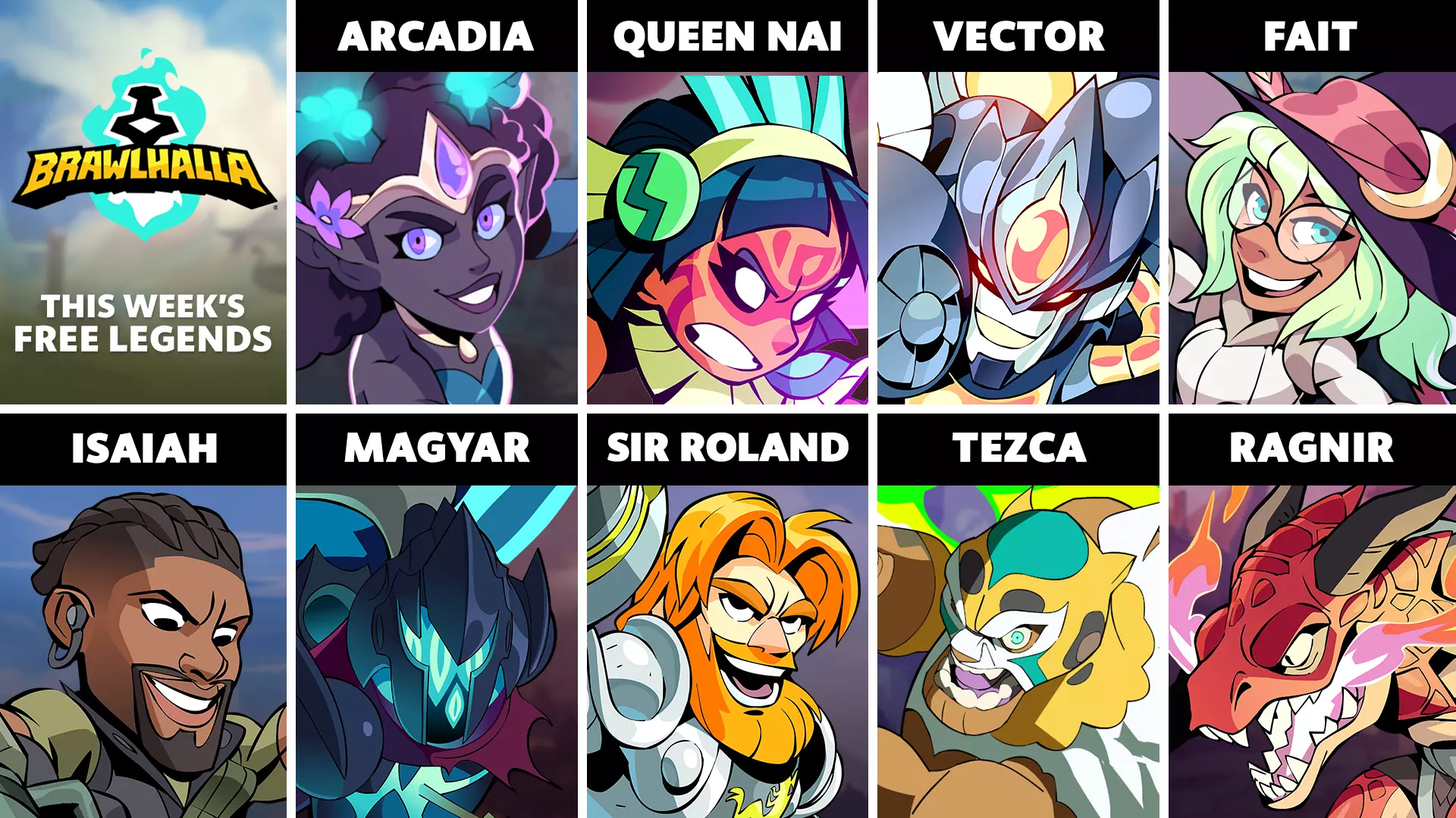 本周免费英雄轮换包括:阿卡迪亚、奈伊女王、维克托、费特、以赛亚、马扎尔、罗兰爵士、特兹卡和拉格纳。 阿卡迪亚——从谦逊的甲虫农夫蜕变为荣耀的仙族女王。作为芳野的伟大冠军,阿卡迪亚携带着会唱歌的巨剑“奥尔玛”、她的邪术荆棘长矛以及忠实的甲虫伙伴“多莫”征战大锦标赛。 奈伊女王——每一场胜利都滋养着她族人的神明,奈伊女王手持短刀、长矛,并凭借强大的巫术参战。 维克托——他能变形成喷气式飞机,使用火箭 lance(长矛)和弓箭战斗,穿越时空打击罪恶! 费特——与星辰对话并运用未来的片段,费特挥舞着镰刀和宝珠为正义而战!以赛亚——OEL特种部队指挥官以赛亚·马歇尔少校听候差遣。他借助配备了隐形装置和火箭弹的无人机,使用加农炮和爆破枪作战! 马扎尔——作为巴达维亚斯特拉兹奇军队仅存的成员,这位幽灵守护者拥有百名精锐骑士的力量,手持巨剑与战锤,为战斗的荣耀而来! 罗兰爵士——在瓦尔哈拉,没有人比罗兰爵士更渴望在锦标赛中获胜,他用火箭 lance(长矛)和剑击倒对手。 特兹卡——世界上最伟大的 luchador( luchador ),同时也是一位古老的神明。特兹卡在擂台上用他的拳套和战靴制定自己的规则!拉格尼尔——这位栖息于尖牙荒野的顶级掠食者,如今手持短刀与战斧向外闯荡,准备在英灵殿中挑战其他所有传奇战士!