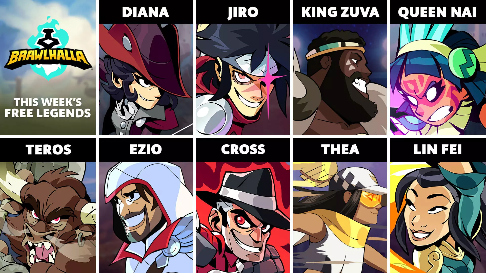 本周免费英雄轮换包括:戴安娜、吉罗、祖瓦王、奈伊女王、特罗斯、埃齐奥、克罗斯、西娅和林 Fei。 戴安娜——骑士团猎人指挥官,她使用弓箭和爆破枪斩杀了无数野兽与怪物。 吉罗——自幼接受强大而神秘的忍者家族训练,吉罗不仅手持镰刀与剑,还能召唤影分身进入竞技场! 祖瓦王——一位富有魅力且受人尊敬的领袖,他挥舞着巨锤与战靴,力量如奔牛般势不可挡! 奈伊女王——每一次胜利都在滋养她族人所信仰的神明,奈伊女王手持短刀、长矛,并施展强大的巫术。 特罗斯——这位牛头人对锦标赛的规则或意图毫不在意。相反,他在所有战斗中都带着狂野的喜悦,用巨斧和战锤粉碎对手。 埃齐奥——一生行善的回报是在英灵殿获得永恒。他挥舞着奥迪托雷之刃和伊甸苹果,准备用自己的刺客技能对付任何挡路的狂暴对手。 克罗斯——多年来他掌控着纽约市,但他能在英灵殿做到同样的事吗?这位魅力十足的黑帮分子带着爆破枪和护手进入了英灵殿。 西娅——你通常会看到西娅在雷霆堡体育场用她的战斗靴和火箭 lance(原词)踢向阿斯加德。她在乱斗球、闪避炸弹以及所有英灵殿永恒体育锦标赛中都是首屈一指的。 林 Fei(原词)——无辜者的守护者,失落之道的导师。她是一位杰出的老师,创造了属于自己的战斗风格——“铁龙之道”。这一风格融合了她的火炮、短刀以及祖传的龙魂之力。