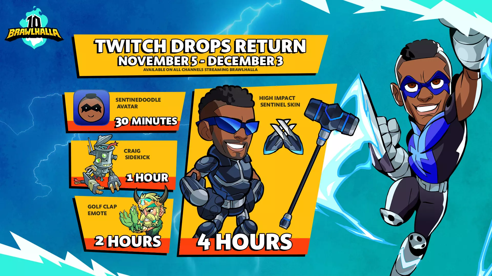 《英灵乱战》10周年活动:Twitch掉落奖励回归公告 Twitch主播与观众们,欢呼吧!作为10周年庆典活动的一部分,《英灵乱战》Twitch掉落奖励盛大回归。 主播方面,本次掉落活动将在全品类开放。只要你符合掉落资格,即可参与。 观众方面,观看任何在Twitch上开启掉落功能的《英灵乱战》直播,即可赢取奖励。 以下四个奖励将分别在观看满30分钟、1小时、2小时和4小时时解锁: ① 哨兵涂鸦头像 ② 克雷格伙伴 ③ 高尔夫鼓掌表情 ④ 高冲击哨兵皮肤 请确保你的Ubisoft Connect账户已与《英灵乱战》ID绑定,以便领取Twitch掉落奖励!账户绑定常见问题。